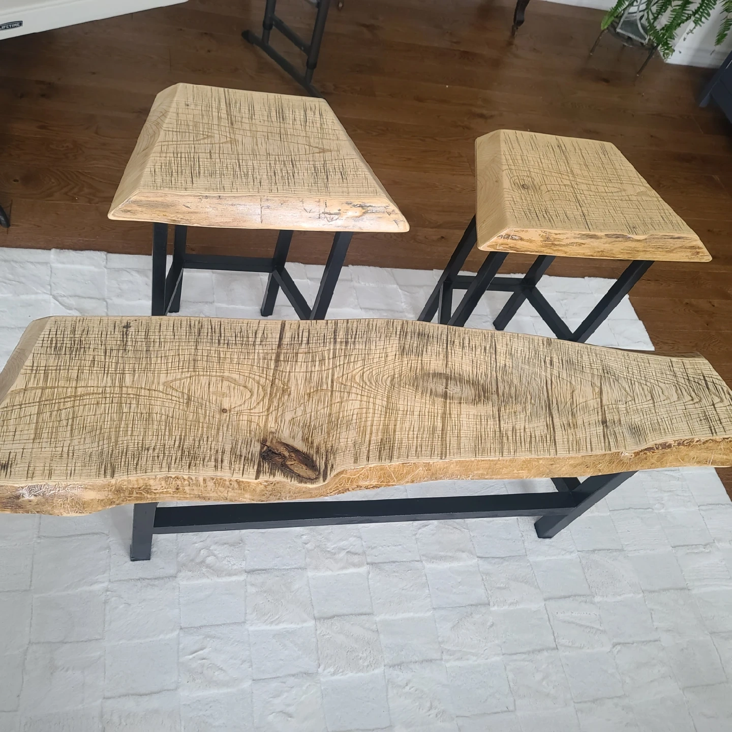 10Selling a beautiful set of handcrafted live edge wood furniture! Includes a bench/coffee table and two side tables. The natural wood grain and unique edge details make each piece one-of-a-kind. The sturdy black painted wood legs provide a modern contrast. Perfect for adding a rustic and stylish touch to your home