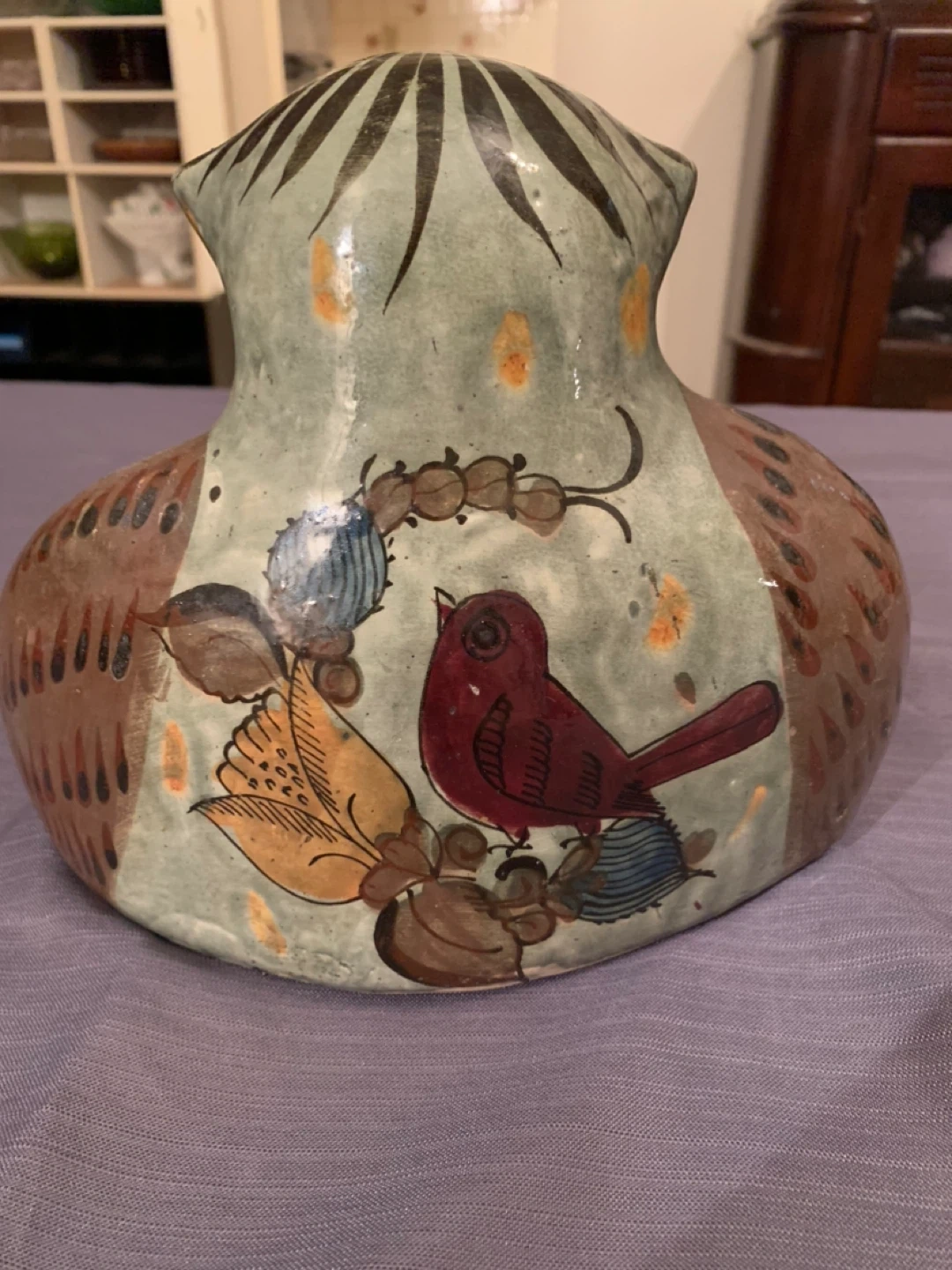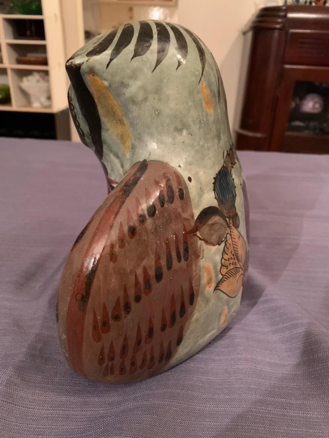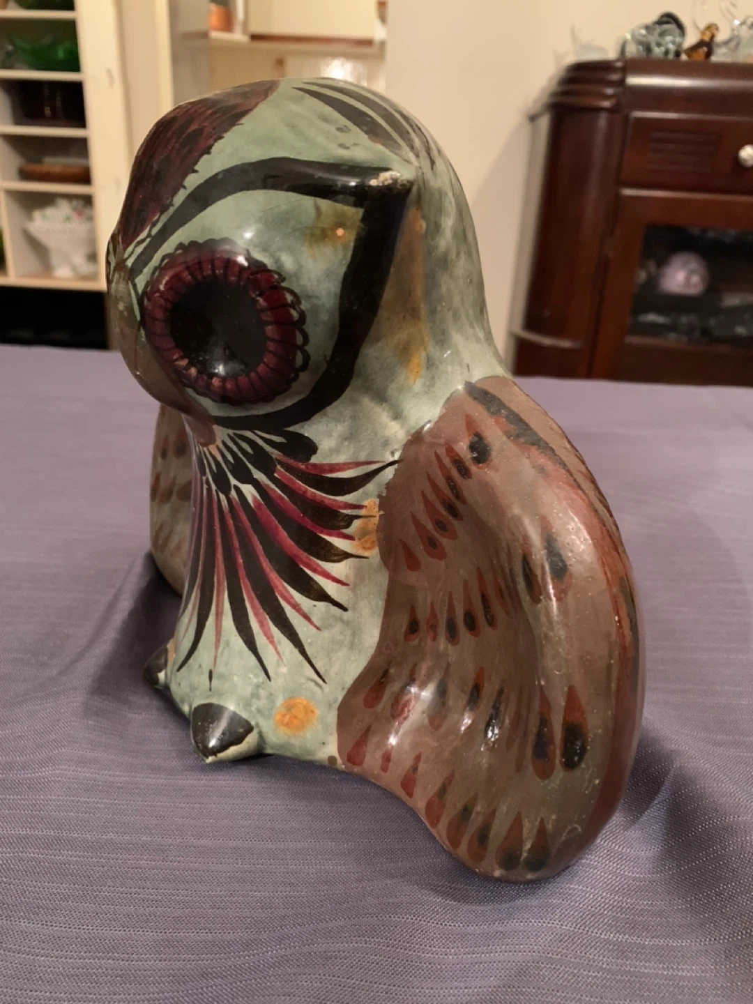 Unique, handcrafted owl figurine from Mexico! This charming piece features intricate details and vibrant colours, making it a lovely addition to any home. It has a rustic, artisanal feel that adds character to any space