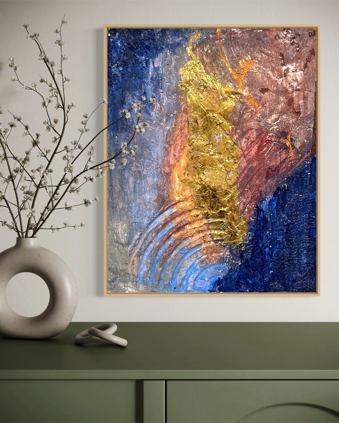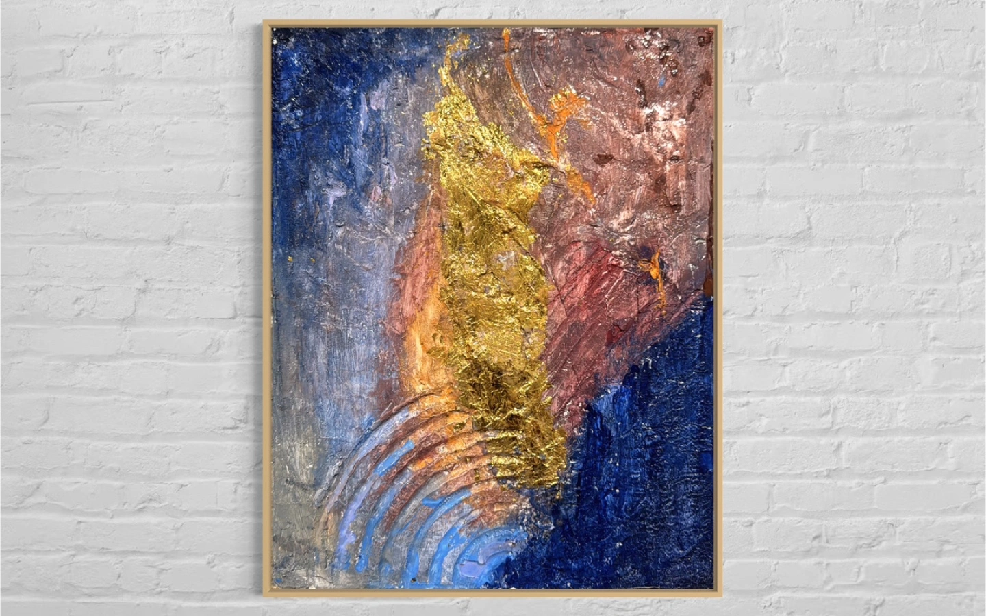 “Sunset Abstract by Abhi” radiates with the brilliance of twilight, blending molten gold with fiery oranges, deep crimsons, and twilight blues. The gilded tones shimmer through the composition, symbolizing light’s last embrace before nightfall. Rather than depicting a horizon literally, Abhi channels the sunset’s energy into a flowing, abstract expression — a meditation on warmth, transition, and renewal. Size - 11”x14”