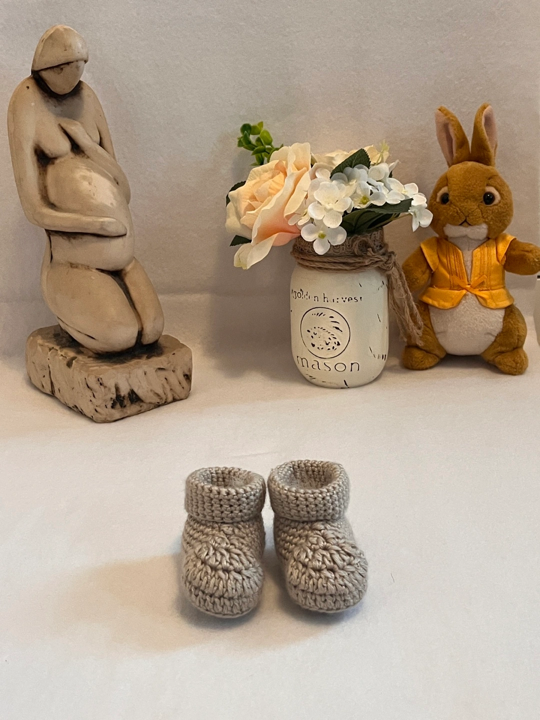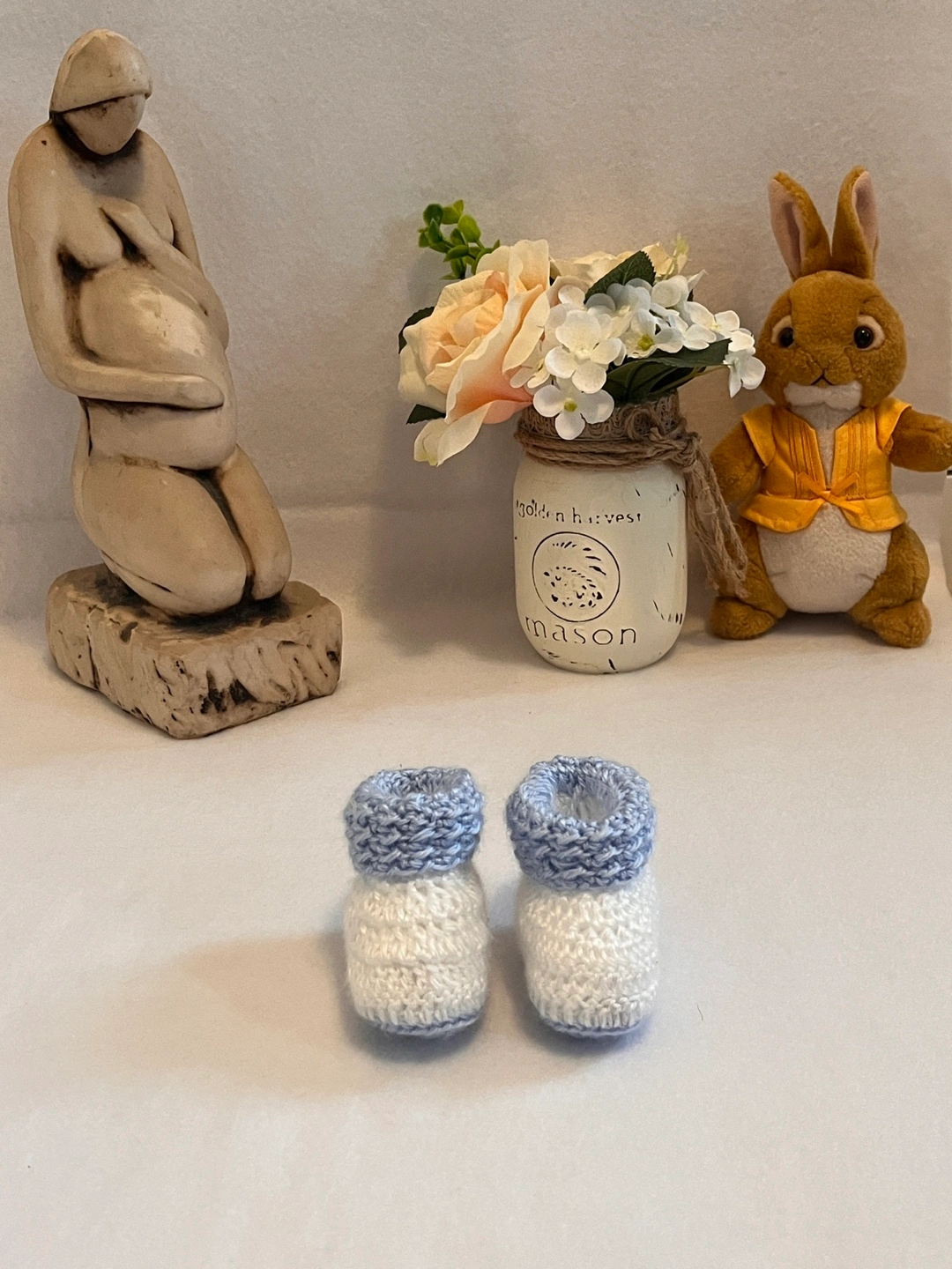 Adorable handmade baby booties. Two pairs included, one light blue and white, one grey. Soft and cozy, perfect for newborns. Great for a baby shower gift.