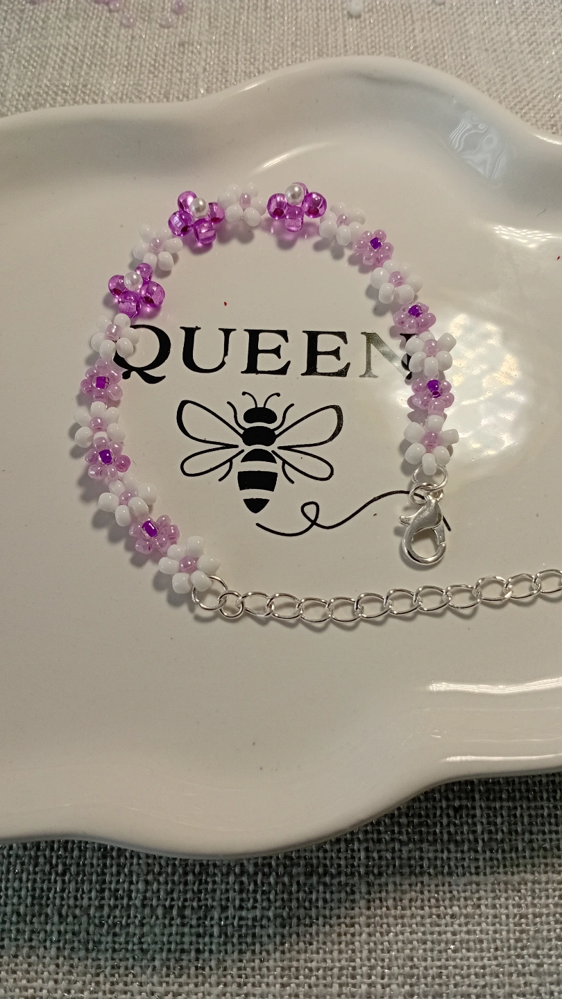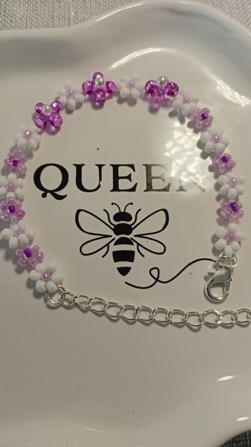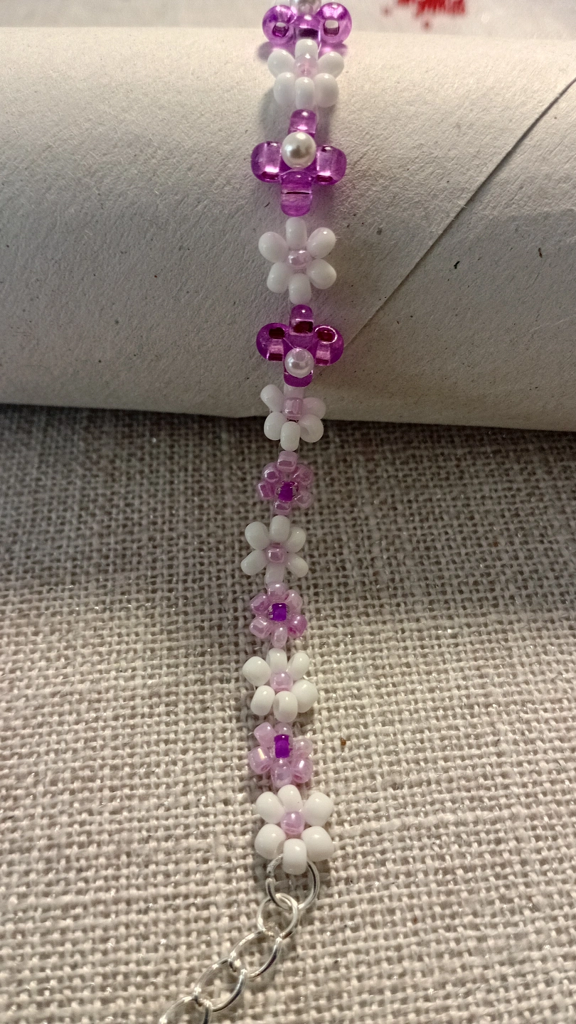 Delicate beaded bracelet. Made with purple and white beads. Daisy flower pattern.Silver plated clasp. Lovely addition to any outfit.