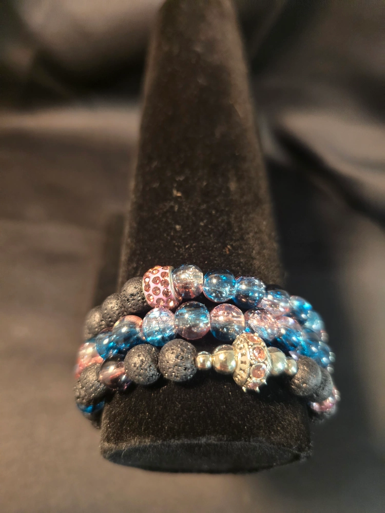 94Selling a set of handmade beaded bracelets. They feature a mix of blue, pink, and black lava beads. Perfect for adding a pop of colour to any outfit!
