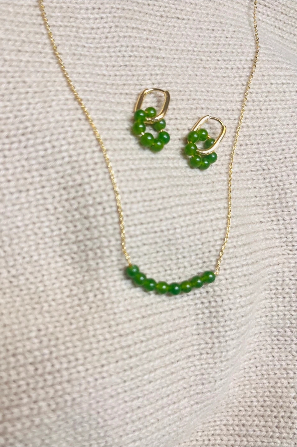 70Check out these cute handmade beaded necklaces and earring sets! They come in a variety of colours, perfect for adding a pop to any outfit. The necklaces feature delicate gold chains and the earrings are a matching design. A fun and unique accessory!