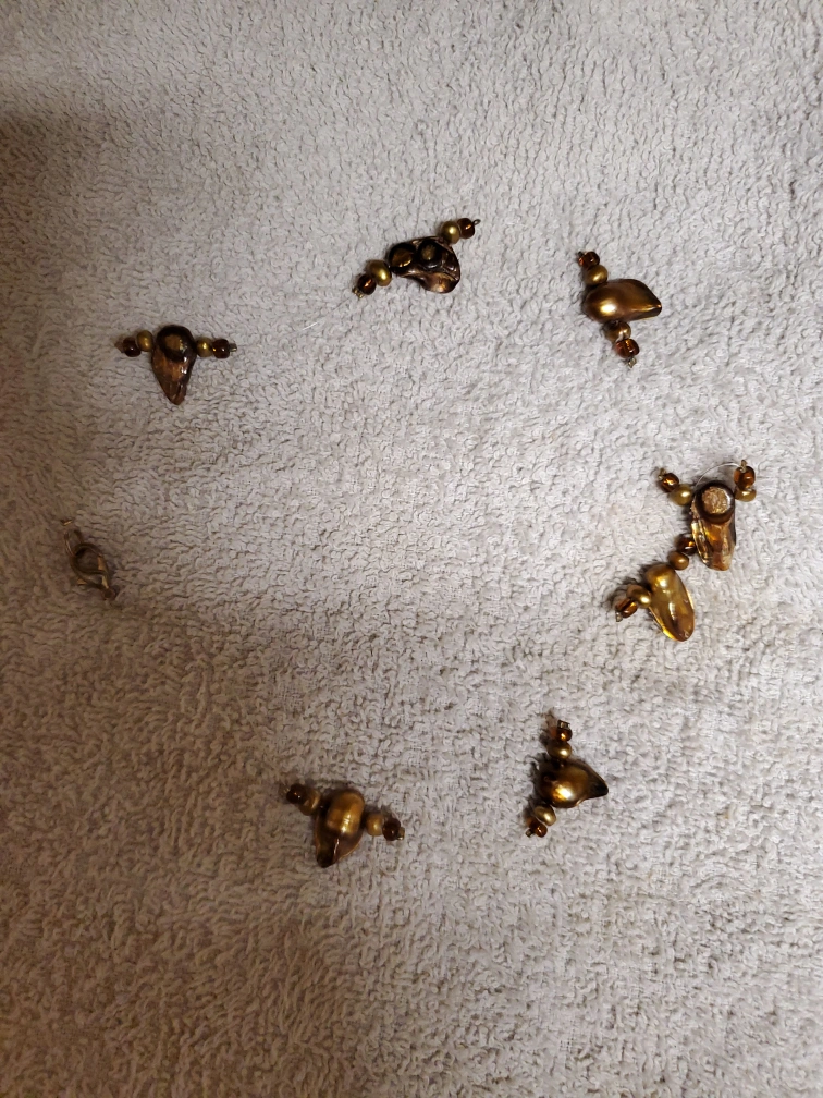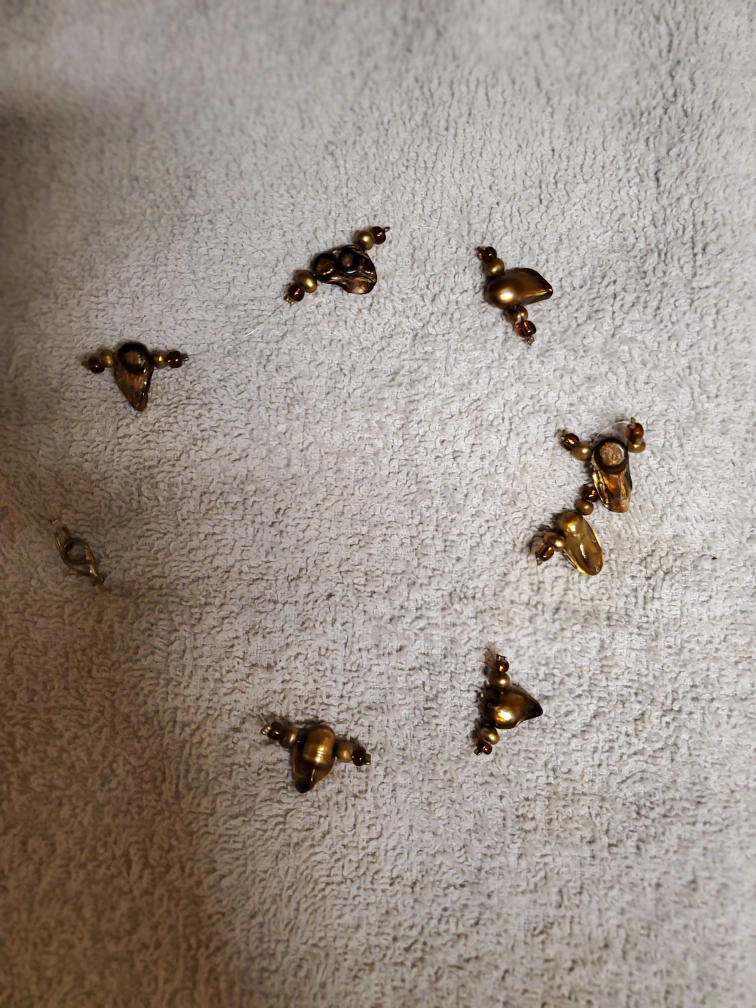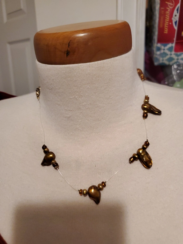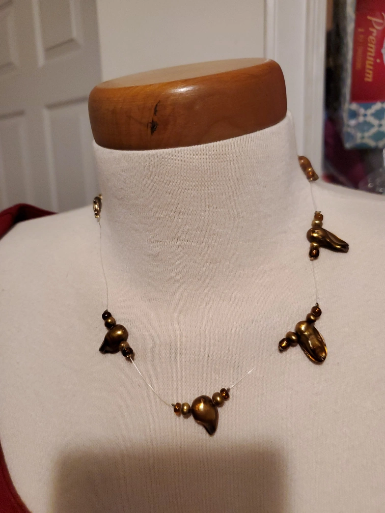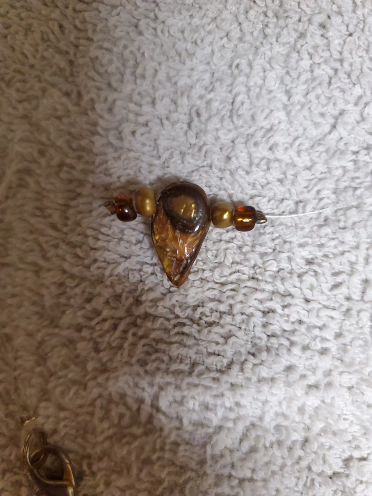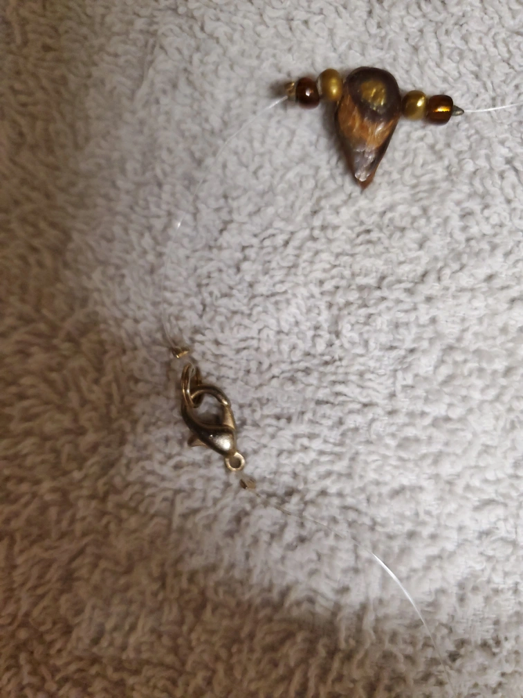 Selling a unique handmade beaded necklace! It features a brown teardrop gold and brown beads strung on a clear line. It has a clasp, so it's easy to put on and take off. Cedar pick up.