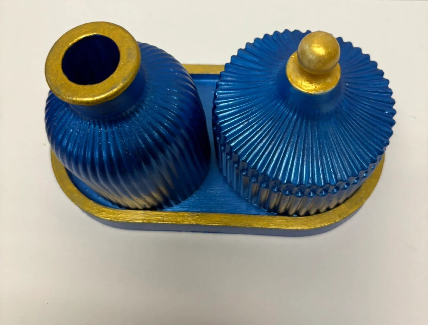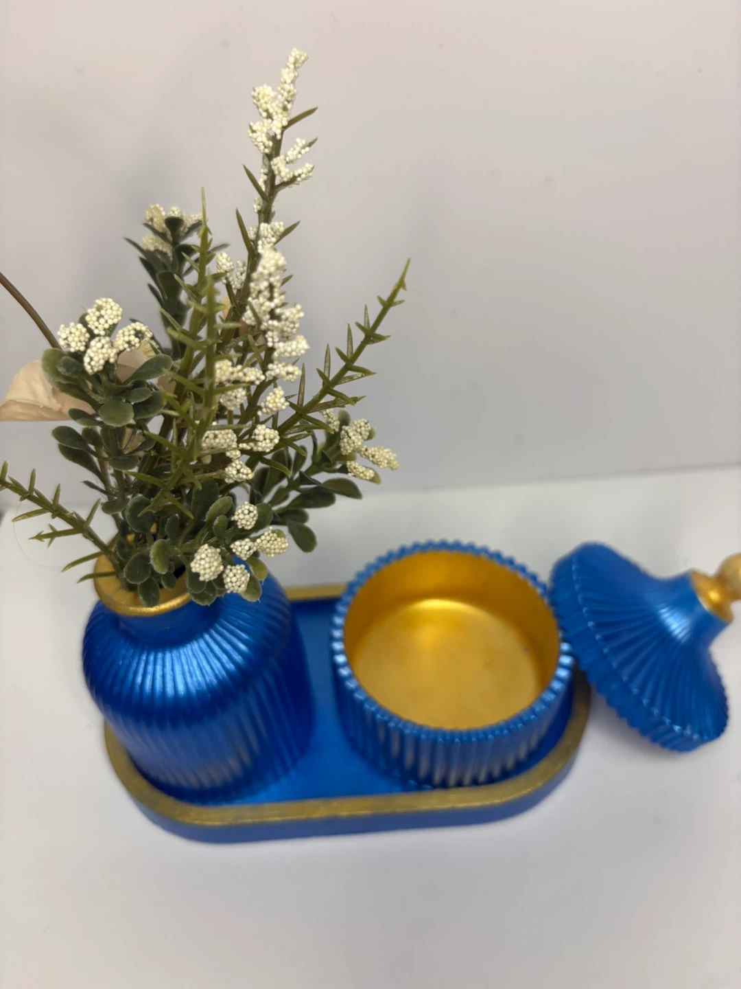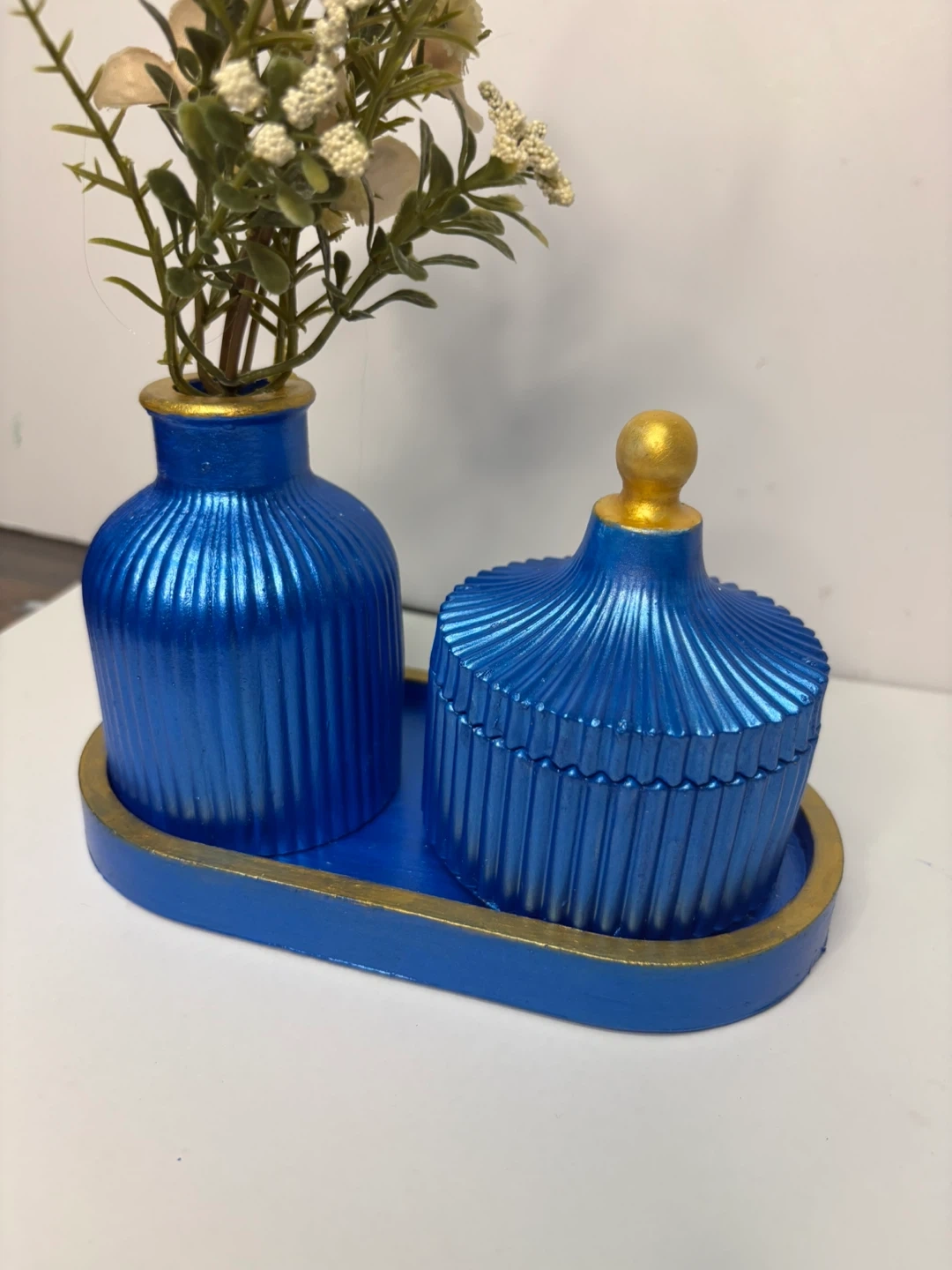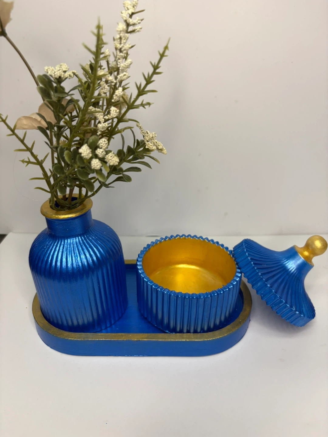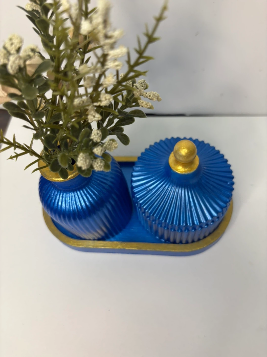 Elevate your space with this stunning, handcrafted Jesmonite decorative set. Featuring a striking metallic royal blue finish accented with subtle gold trim, this three-piece set brings a modern, luxurious touch to any room. This unique set is more than just a beautiful display piece—it's designed to be functional: * The Tray: An oval fluted tray perfectly cradles the two vessels, keeping your surfaces tidy and protected. Use it on your vanity, bedside table, desk, or bathroom counter. * The Bud Vase: A sleek, ribbed bud vase is perfect for holding dried flowers, a single fresh stem, or even pens and makeup brushes. * The Lidded Jar: The matching ribbed trinket jar has a removable lid, making it ideal for storing small items like jewelry, earrings, cotton swabs, hair ties, or spare change.