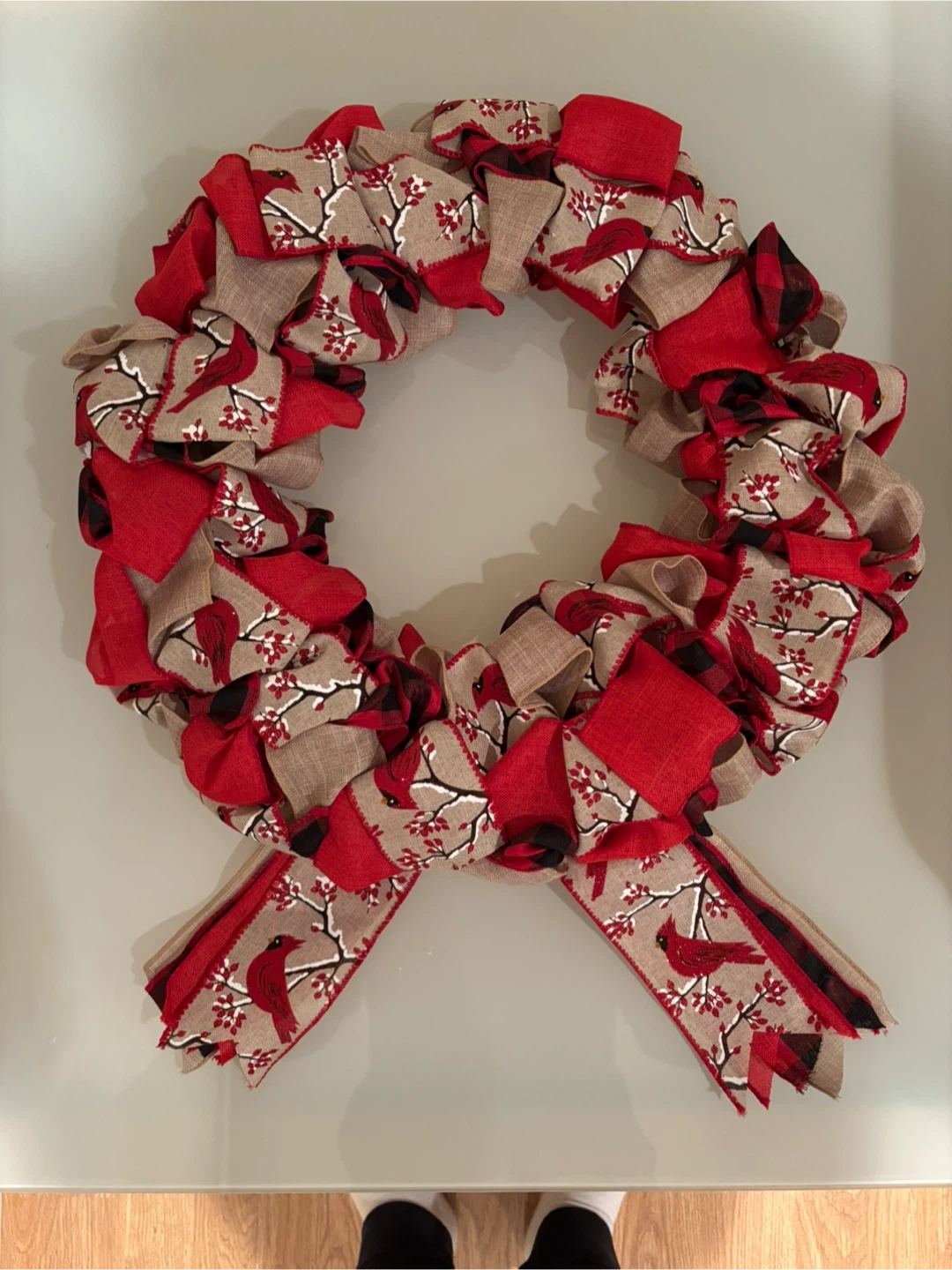 49This is a beautiful handmade wreath, perfect for adding a touch of warmth to your home! It features a lovely combination of red and beige ribbons, adorned with a charming cardinal and floral pattern. It would look great on a door or wall!