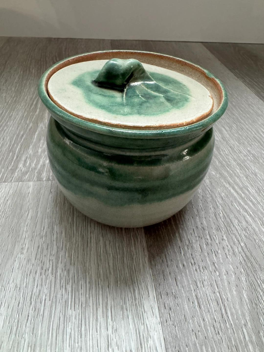 15Pottery jar with lid, approx 3” tall. Will hold liquids, but does not seal.
