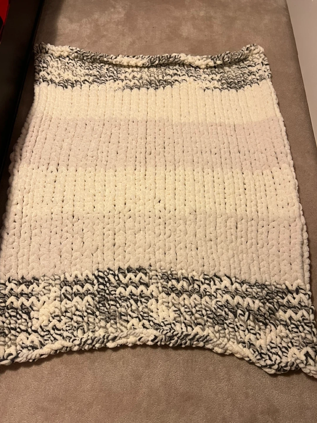 10Selling a cozy, handmade knit blanket! It features a lovely combination of white and greenish brown beige tones, perfect for adding a touch of warmth and style to any room. It's in great condition and ready to be enjoyed