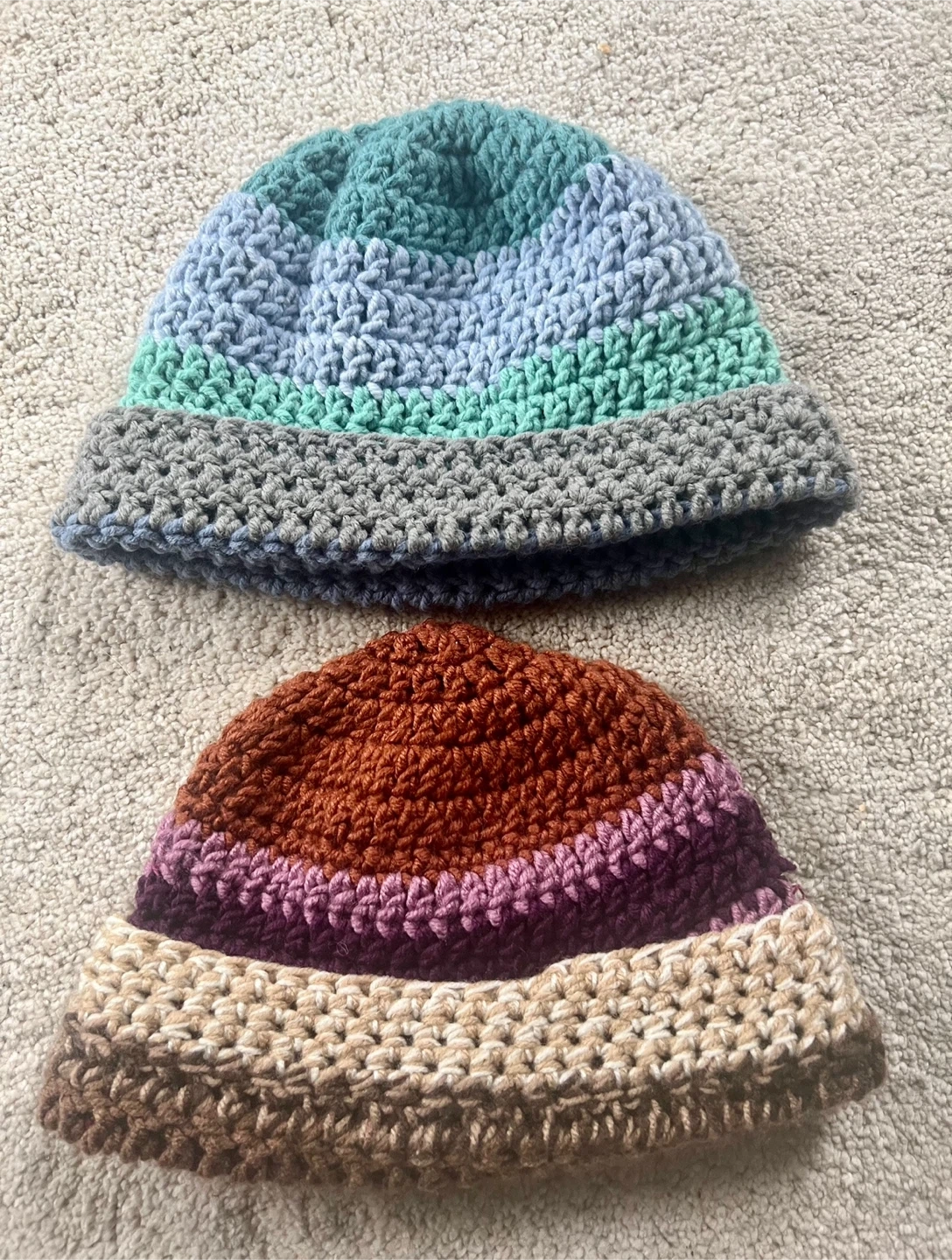 10Selling a set of two handmade crochet beanies! One is in shades of blue and green, and the other is in shades of brown and purple. They're perfect for keeping warm and adding a pop of colour to your outfit $20 each