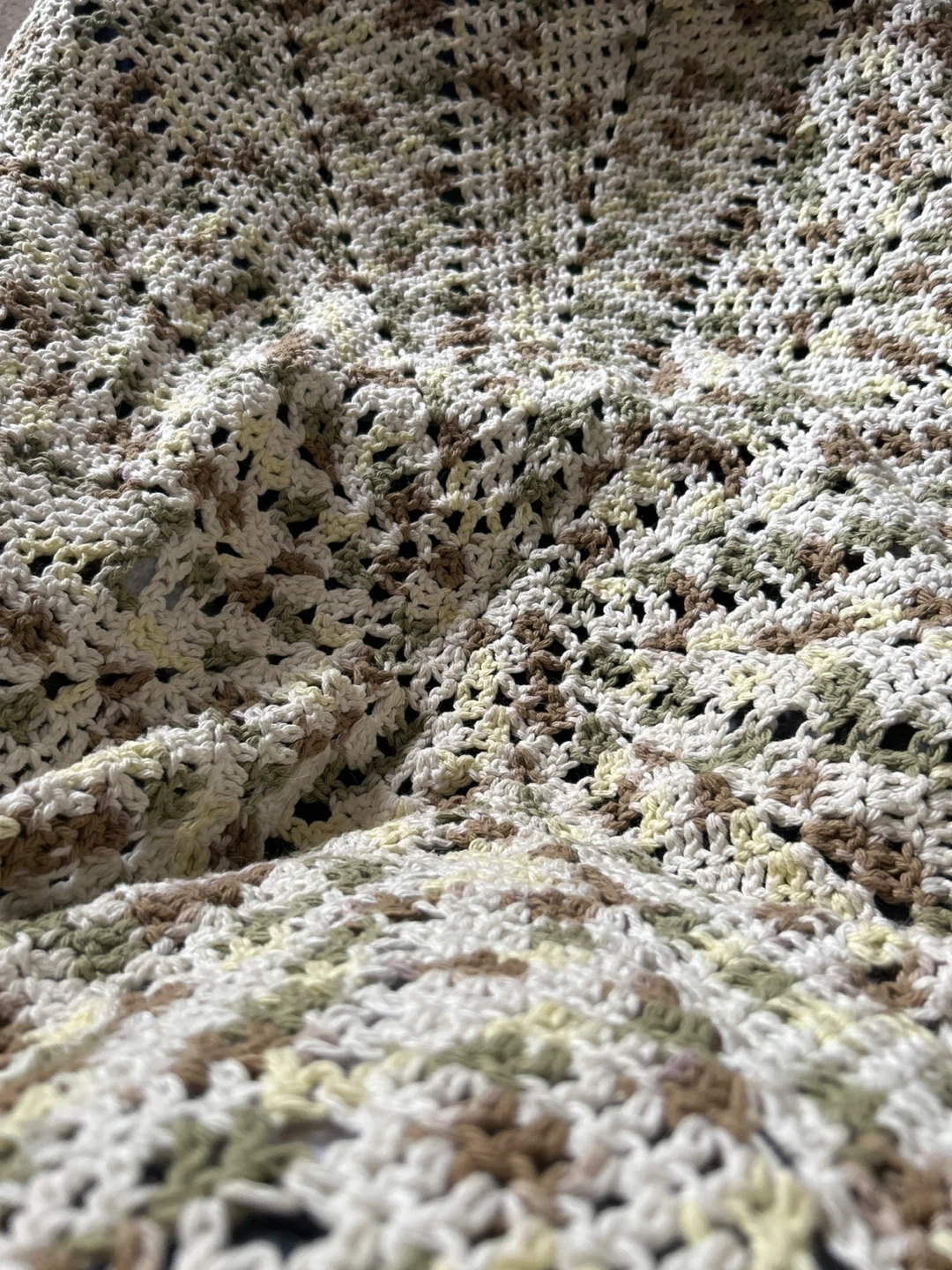 55Selling a handmade circular crochet blanket in excellent condition! It features a lovely pattern with colours of white, green, and brown. This blanket would make a cozy addition to any home