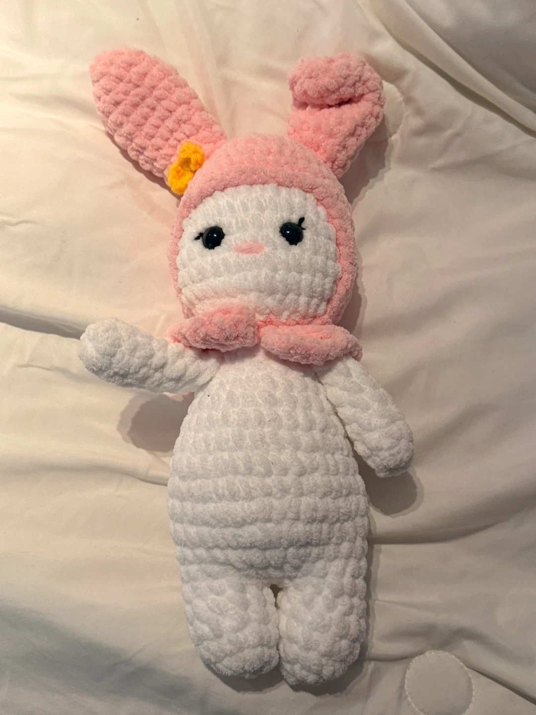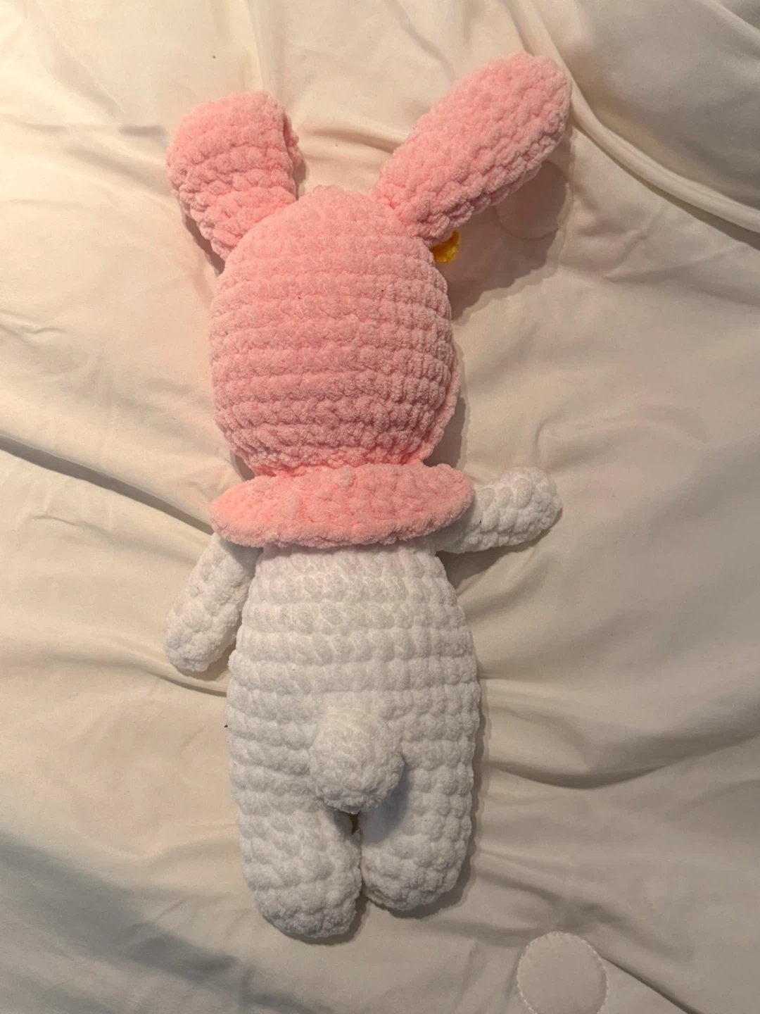 65Selling a handmade crochet bunny plushie! It's a super cute and cuddly little friend, perfect for adding a touch of handmade charm to any room. The bunny is made with soft, high-quality yarn in pink and white. It's in great condition and ready for a new home!