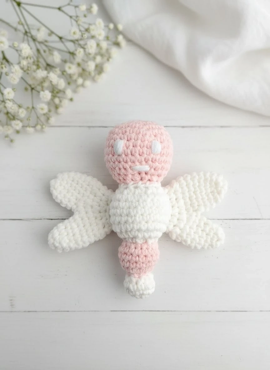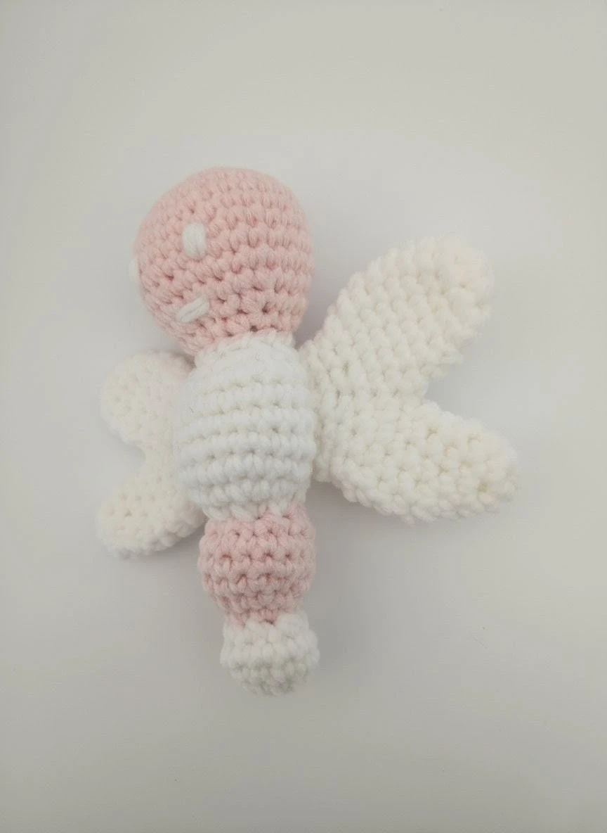 65A cute, handmade crochet butterfly rattle, perfect for a nursery or as a sweet gift! It's made with soft yarn and has a lovely, gentle design. Features a subtle, pleasing rattle sound enclosed safely inside the head, designed to stimulate hearing and captivate your baby's attention.