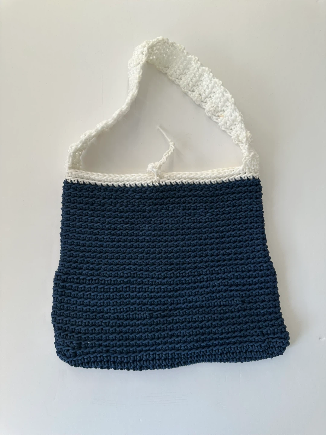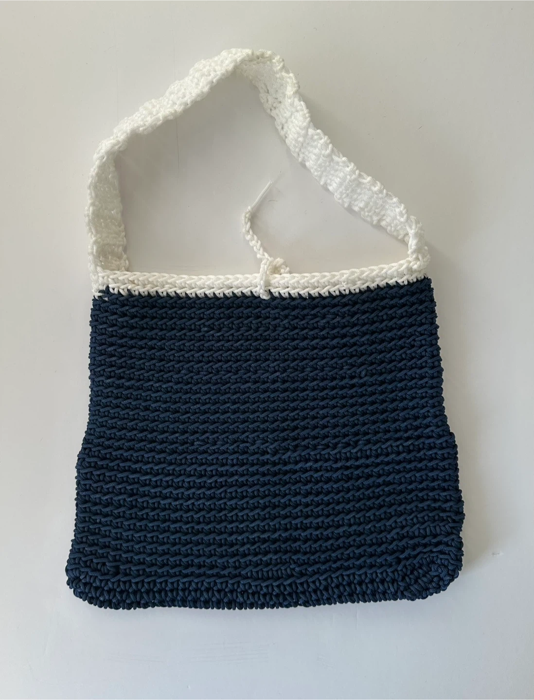 564Selling a handmade crochet shoulder bag. It's a navy blue colour with a white strap. Perfect for carrying your essentials!