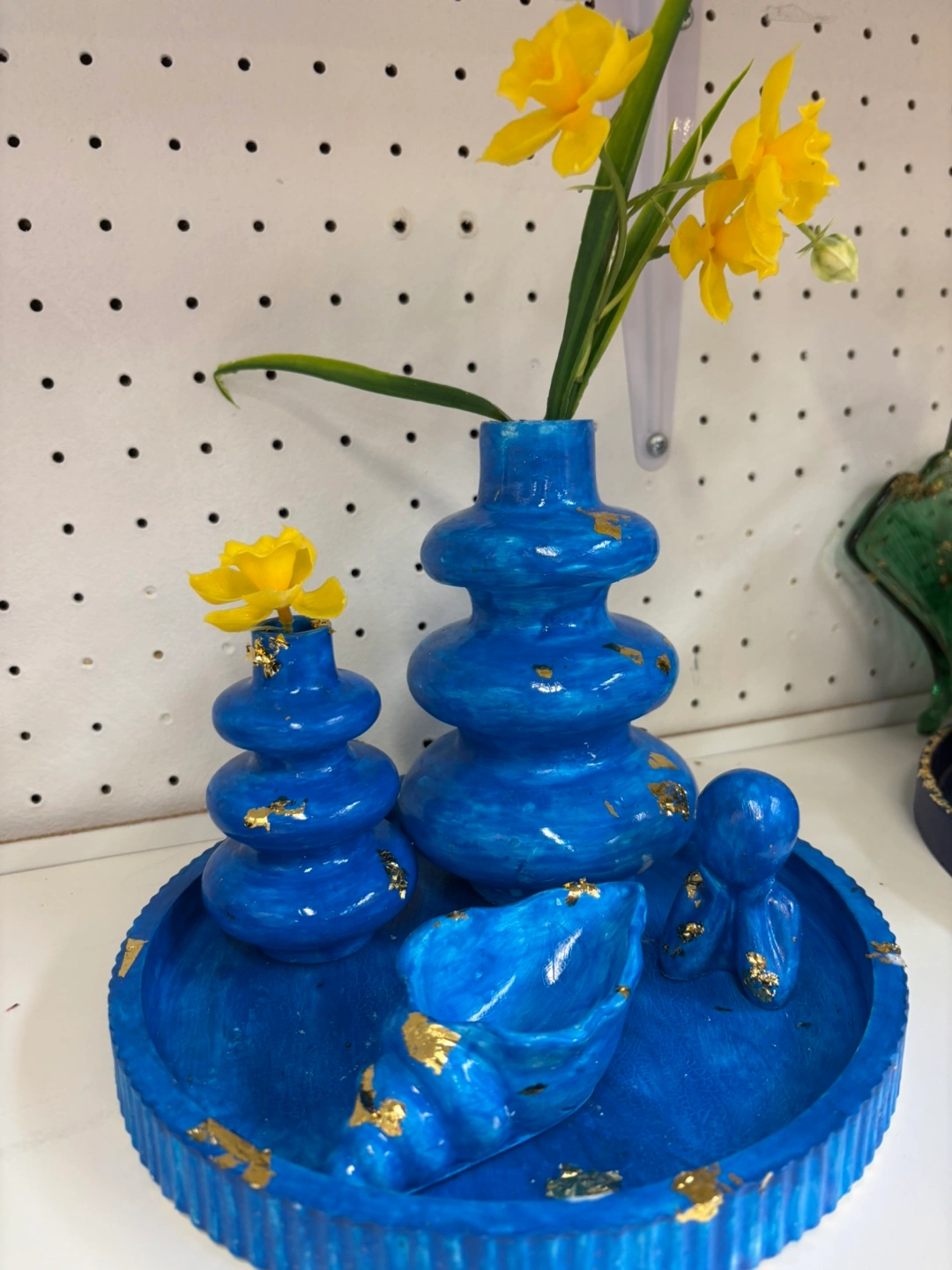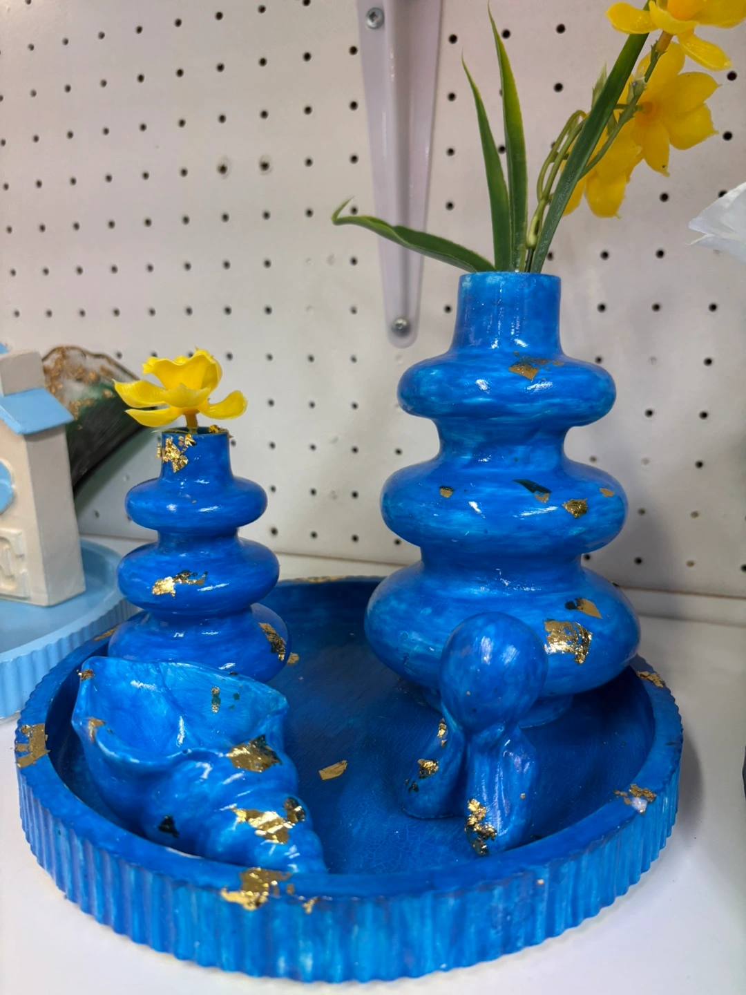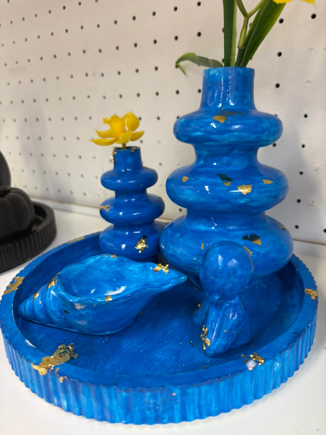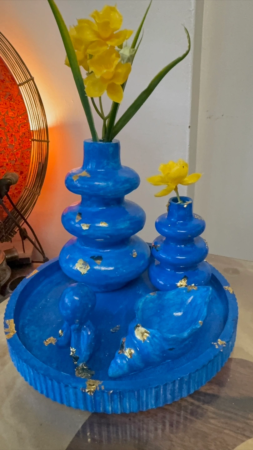 15Bring a touch of modern coastal charm to your home with this unique, handmade Azure Waves decorative tray set. Crafted from eco-friendly Jesmonite, this eye-catching piece features a textured round tray in a vibrant blue hue reminiscent of the ocean. Accenting the tray are two charming bud vases in coordinating blue, perfect for displaying single stems or small floral arrangements, adding a touch of natural beauty to any space, thinking figure, A sculpted seashell adds a delightful seaside element. More than just decorative, this versatile set can also serve functional purposes. Use the tray to organize small items on your coffee table, vanity, or desk, while the bud vases bring life and color to your surroundings. The addition of delicate gold leaf flakes adds a touch of luxurious detail, making this a truly special and one-of-a-kind piece. Hand-poured with care in Toronto, this Jesmonite tray with bud vases and shell accent makes a wonderful gift for housewarmings, birthdays, or anyone who appreciates unique, handcrafted home decor with a coastal vibe.