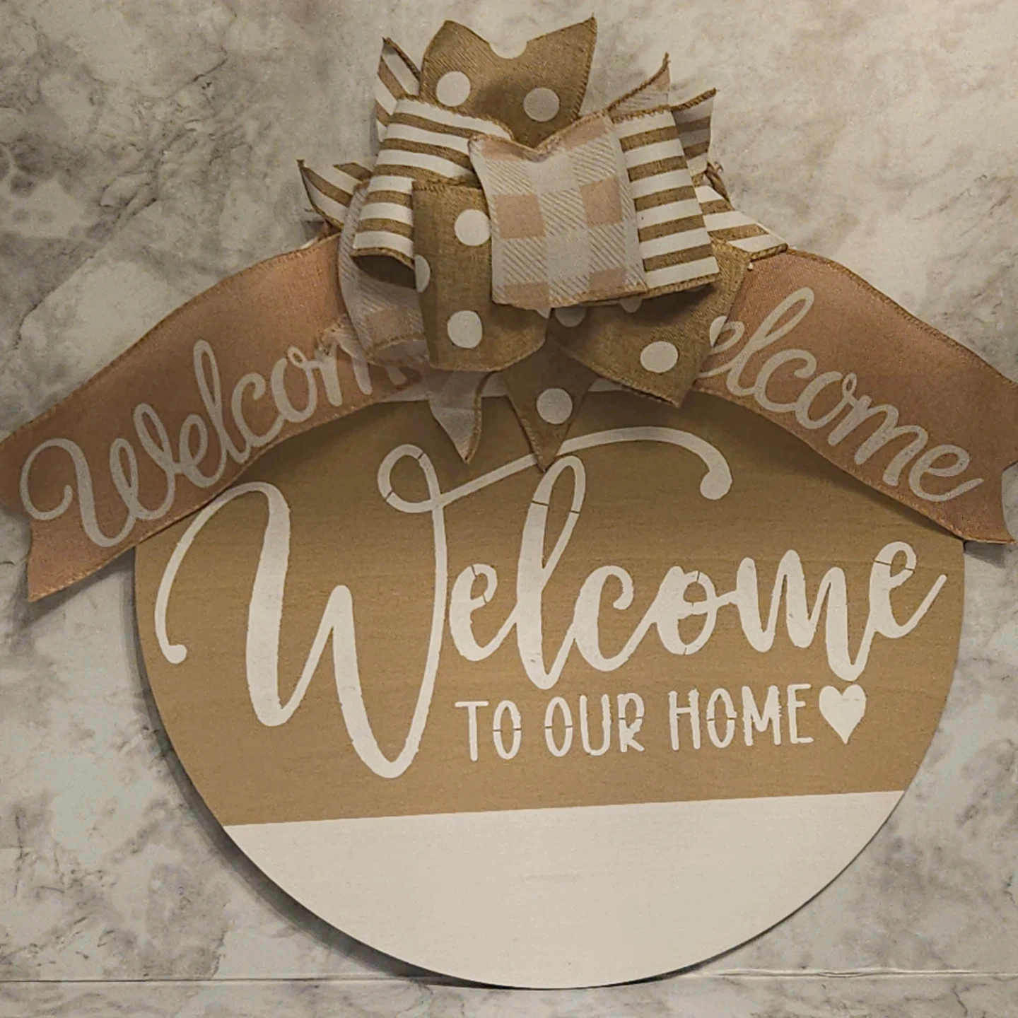 10A cute round wood sign that says 'Welcome to Our Home' with a heart at the end. It has a nice ribbon bow on top. Perfect for adding a warm touch to your entryway or living room. 12 Inches.