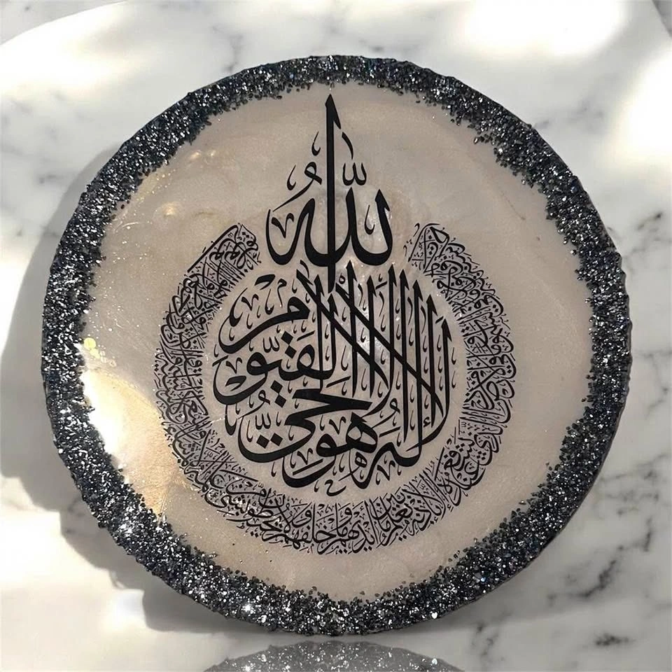 5Beautiful handmade resin décor piece features detailed Arabic calligraphy surrounded by a shimmering black-silver geode border. The elegant design makes it a stunning centerpiece for any home and a meaningful gift for loved ones. ✔️ High-quality handmade resin art ✔️ Intricate Arabic calligraphy design ✔️ Black & silver glitter geode-style border ✔️ Perfect for living rooms, entryways, and prayer spaces ✔️ Ideal for housewarming, Eid gifts, and Islamic home décor