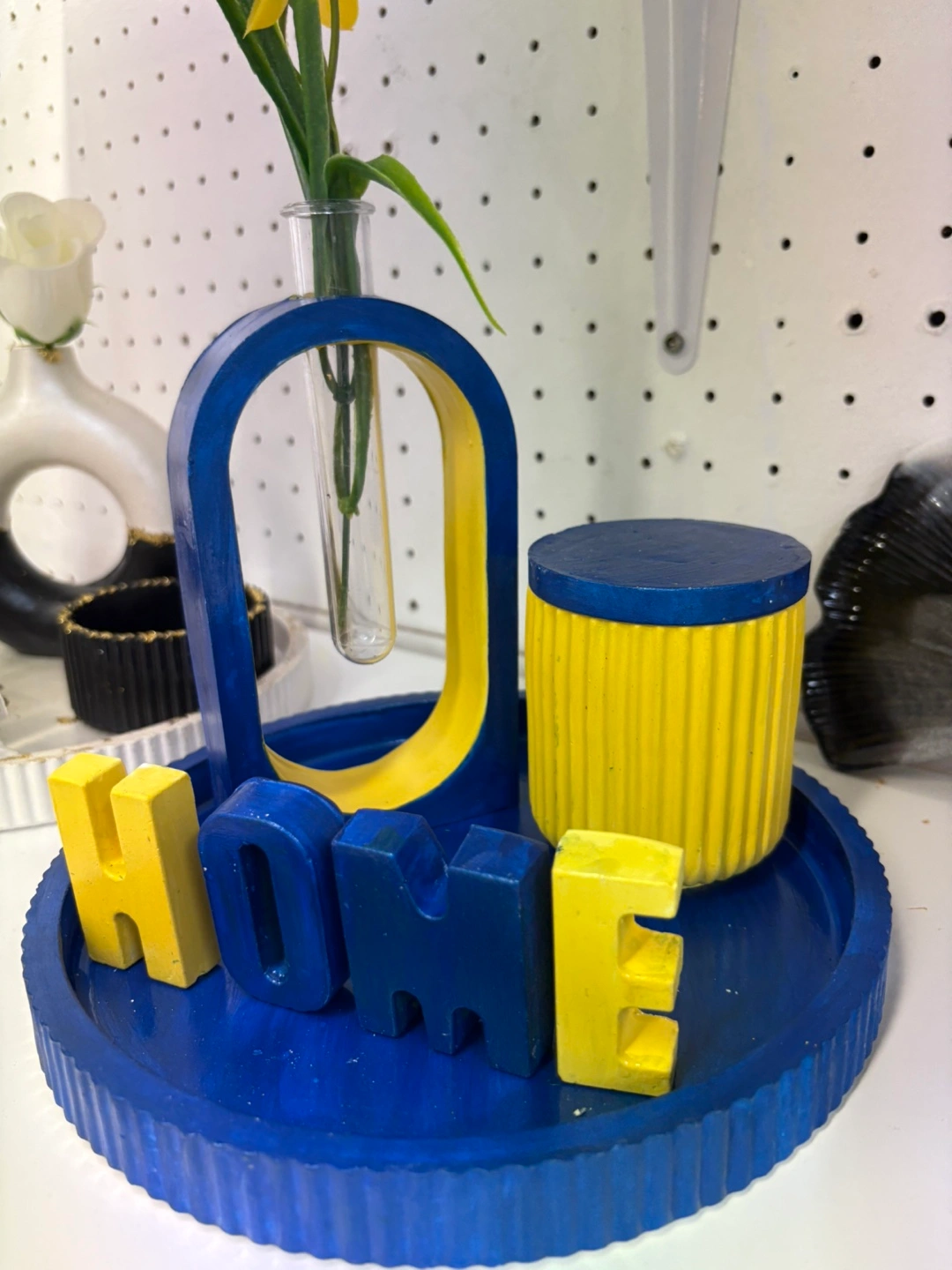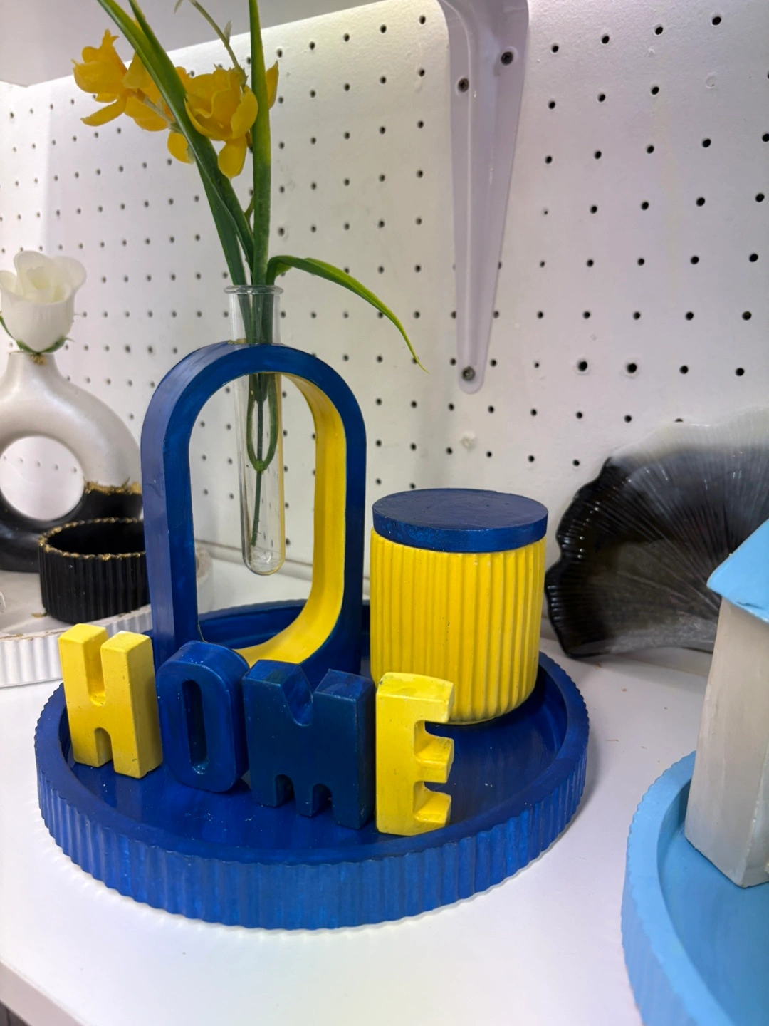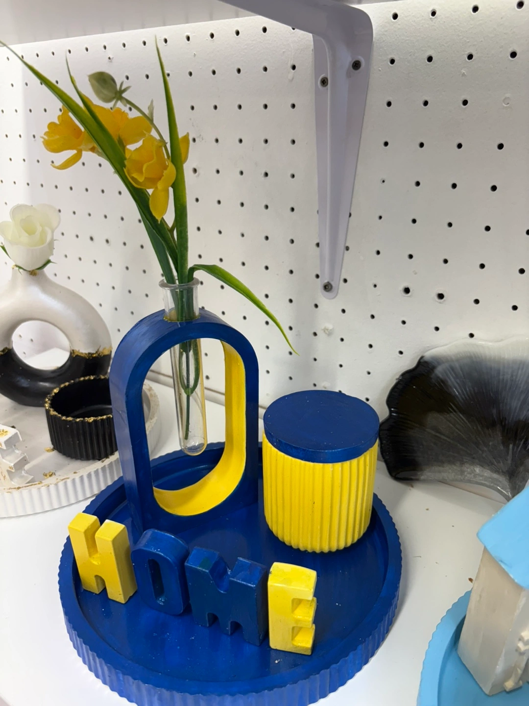 15Add a touch of modern charm and functionality to your home with this unique, handmade Jesmonite decor piece. Crafted with care, this eye-catching tray features a vibrant blue base accented with sunny yellow elements. The design incorporates a built-in test tube vase, perfect for displaying a single stem or small floral arrangement, and a cylindrical storage container ideal for holding small items like pens, makeup brushes, or desk accessories. The word "HOME" is playfully integrated into the design, adding a welcoming touch. Made from durable and eco-friendly Jesmonite, this piece offers a contemporary aesthetic with a handcrafted feel. It's a versatile accent that will look beautiful on a coffee table, desk, shelf, or entryway console. Elevate your home decor with this delightful and practical creation!