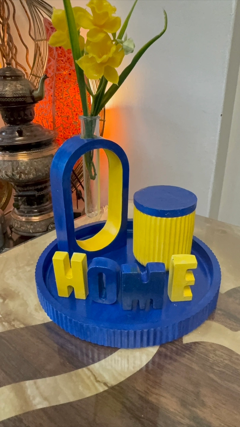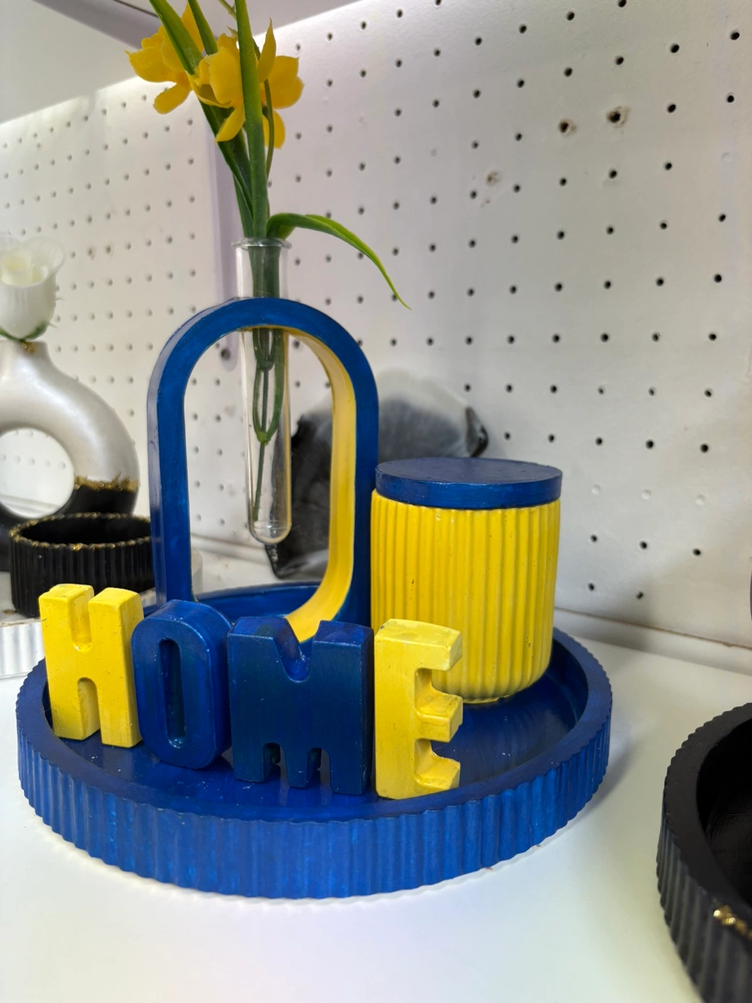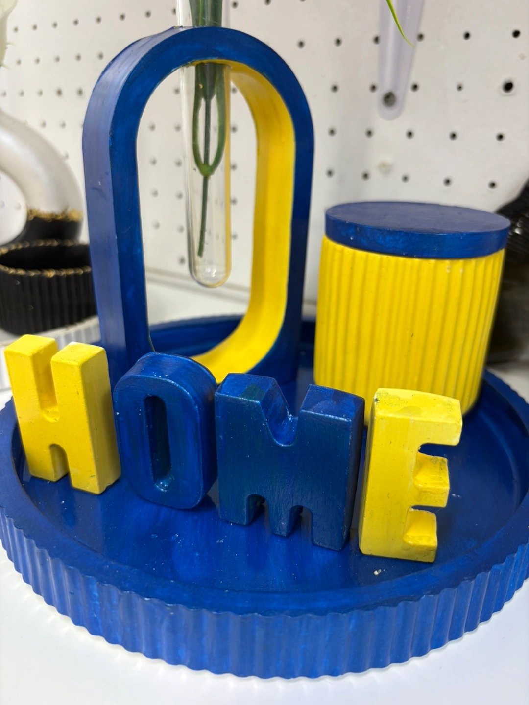 15Add a touch of modern charm and functionality to your home with this unique, handmade Jesmonite decor piece. Crafted with care, this eye-catching tray features a vibrant blue base accented with sunny yellow elements. The design incorporates a built-in test tube vase, perfect for displaying a single stem or small floral arrangement, and a cylindrical storage container ideal for holding small items like pens, makeup brushes, or desk accessories. The word "HOME" is playfully integrated into the design, adding a welcoming touch. Made from durable and eco-friendly Jesmonite, this piece offers a contemporary aesthetic with a handcrafted feel. It's a versatile accent that will look beautiful on a coffee table, desk, shelf, or entryway console. Elevate your home decor with this delightful and practical creation!
