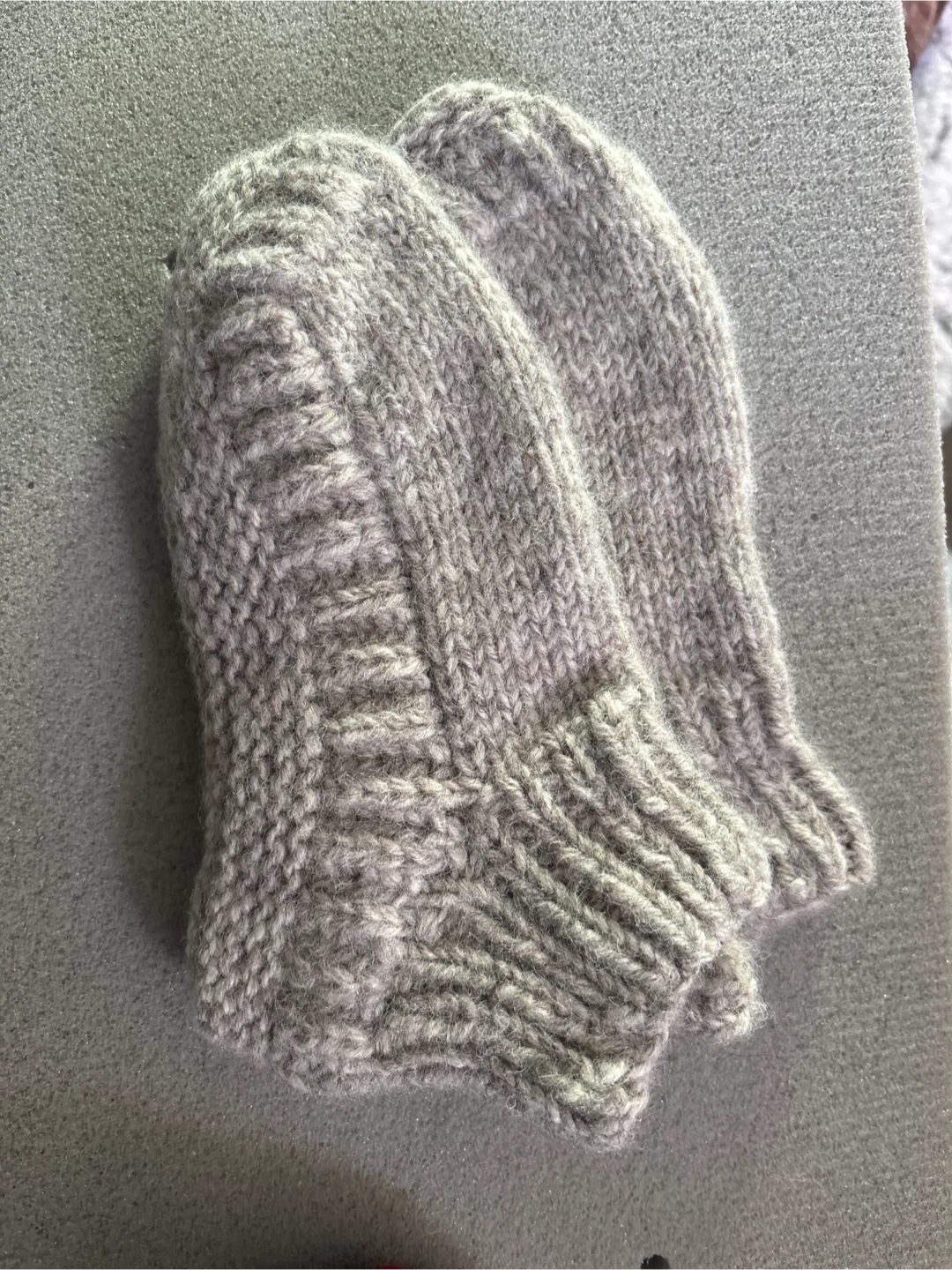 71These are a pair of cozy, handmade knit slippers! They are made from Marano wool and are perfect for keeping your feet warm on cold days. One pair is red, black, white and gray, and the other pair is brown/grey. Asking $10 for each pair.