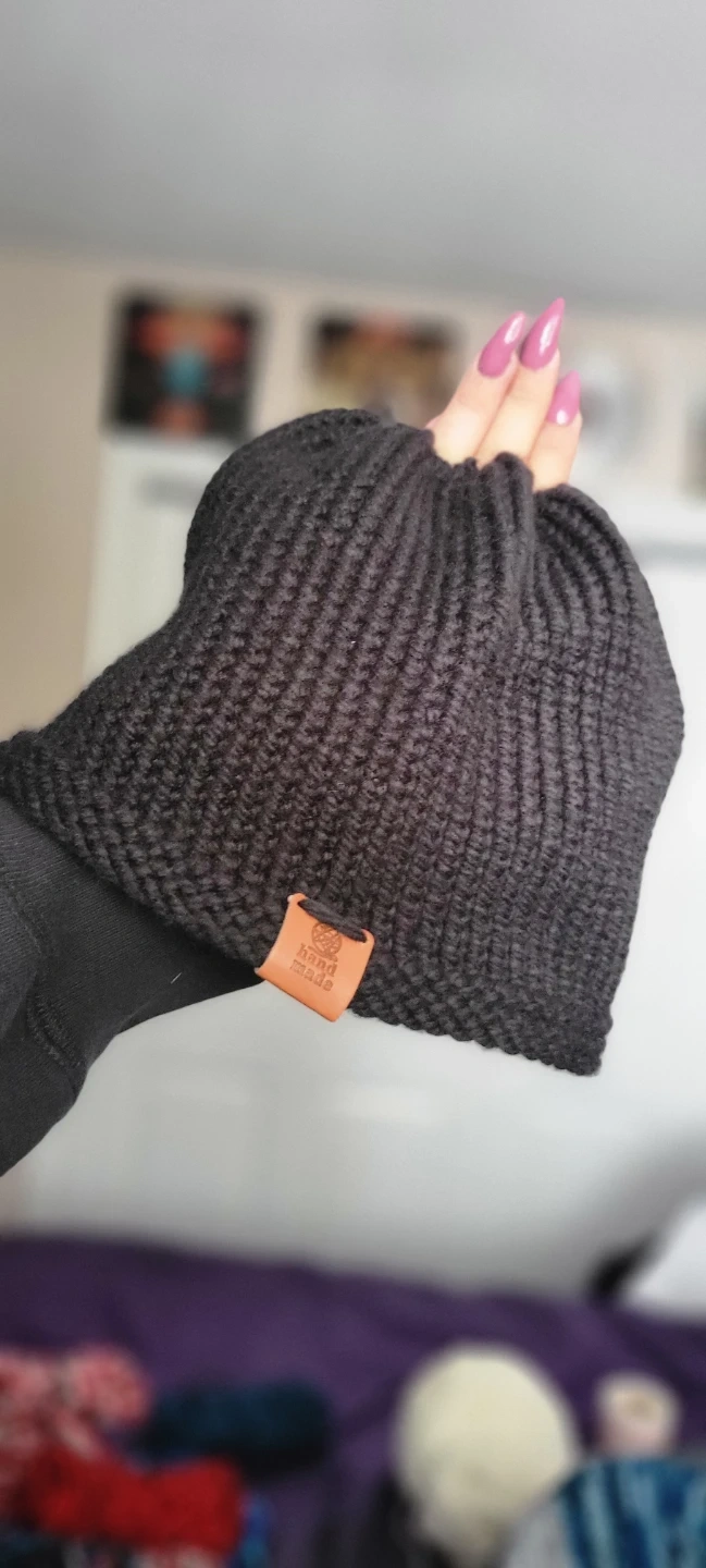 65Cozy up with this handmade knitted beanie! It's a stylish and warm accessory for those chilly days. The black colour makes it versatile to match any outfit. It has a cute 'hand made' tag on the side.