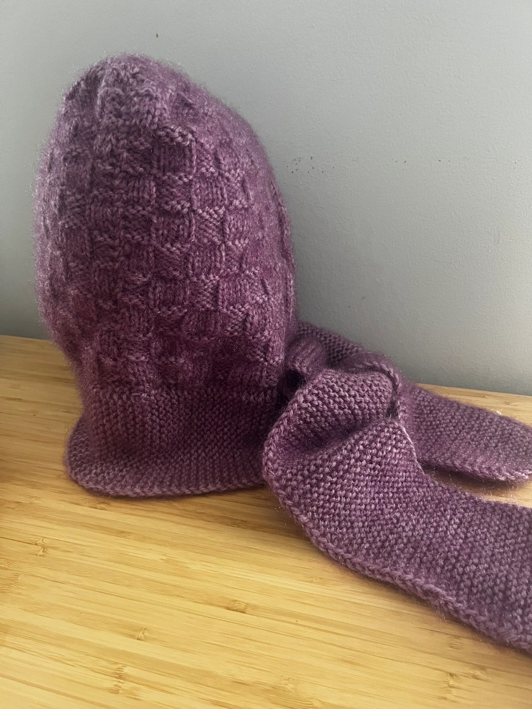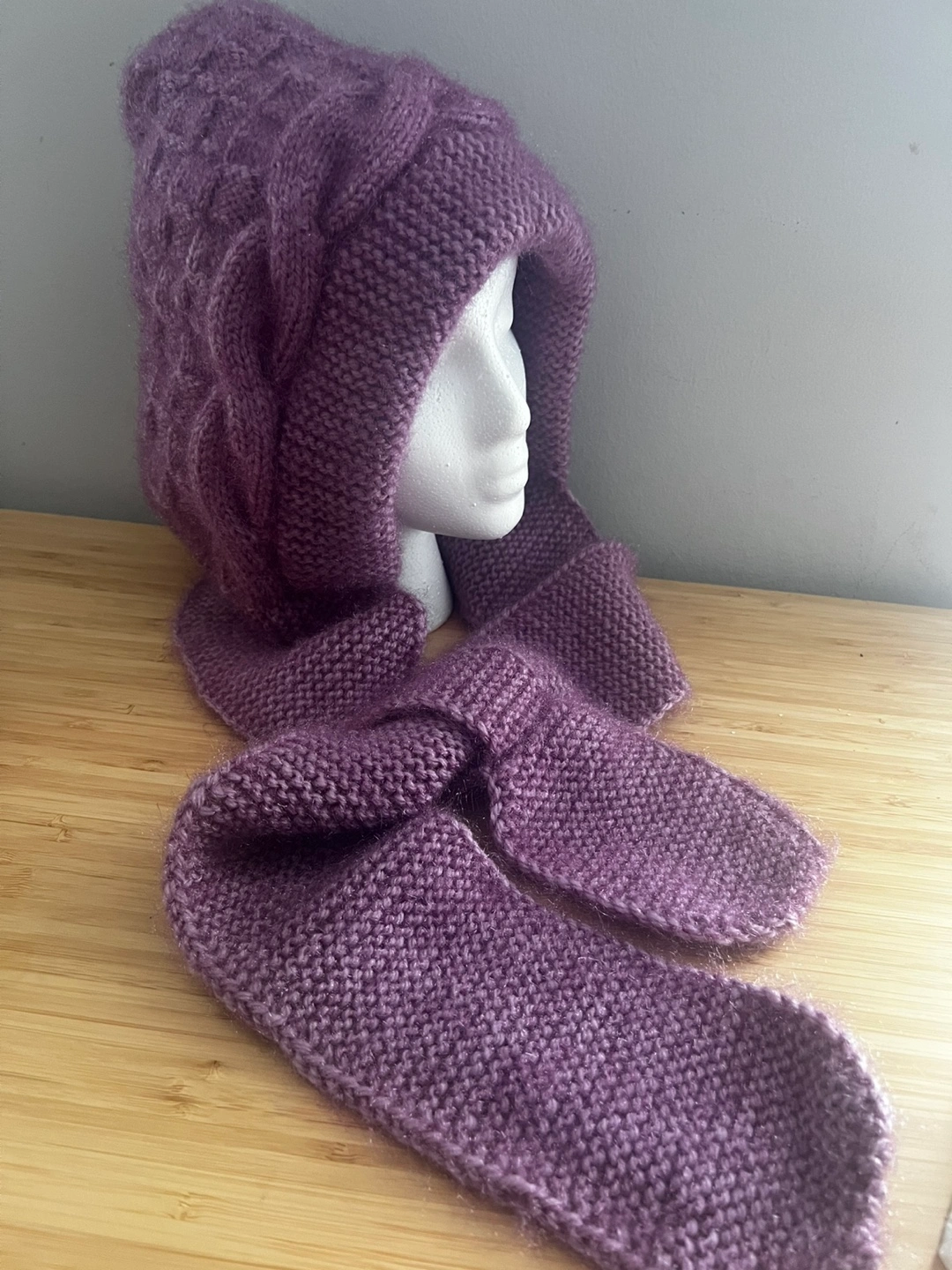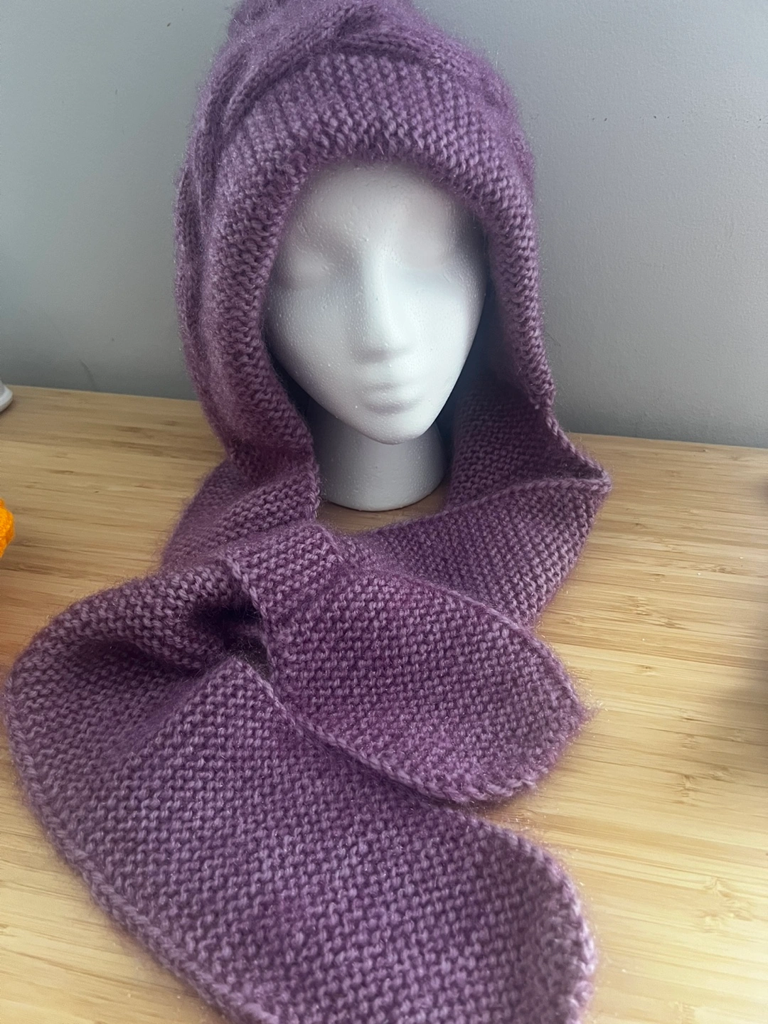 60Selling a handmade knitted hooded scarf in a lovely shade of purple. It's in great condition and super cozy for the colder months! Perfect for staying warm and stylish.