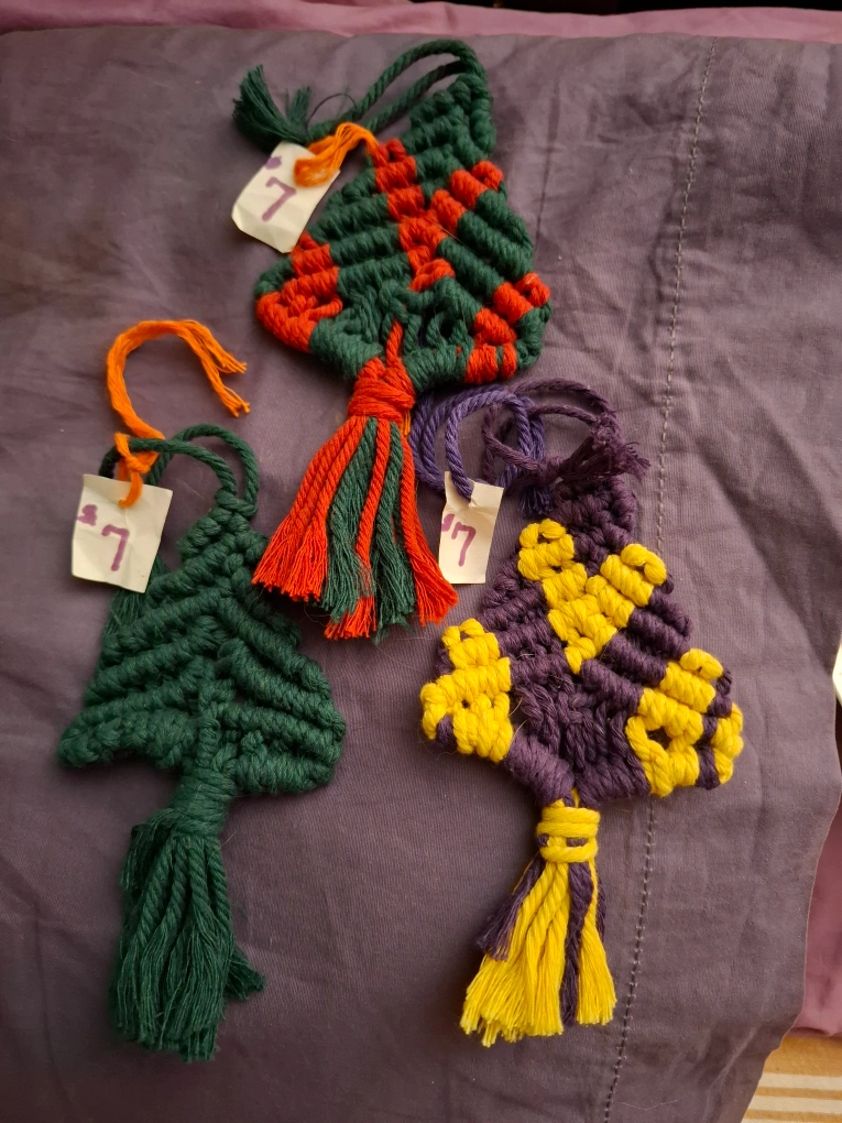 65Set of 3 miniature macrame Christmas trees. Each ornament features a unique colour combination and a small tassel. Perfect for decorating or gift-giving. pick up only...no licence to drive $5 each