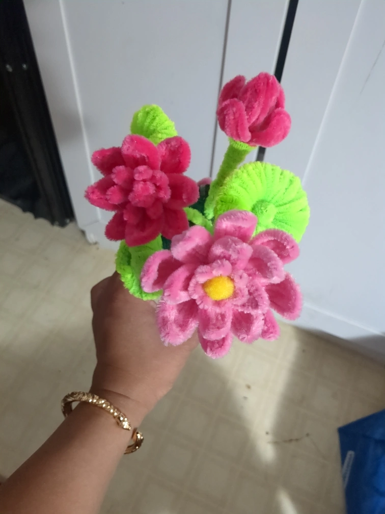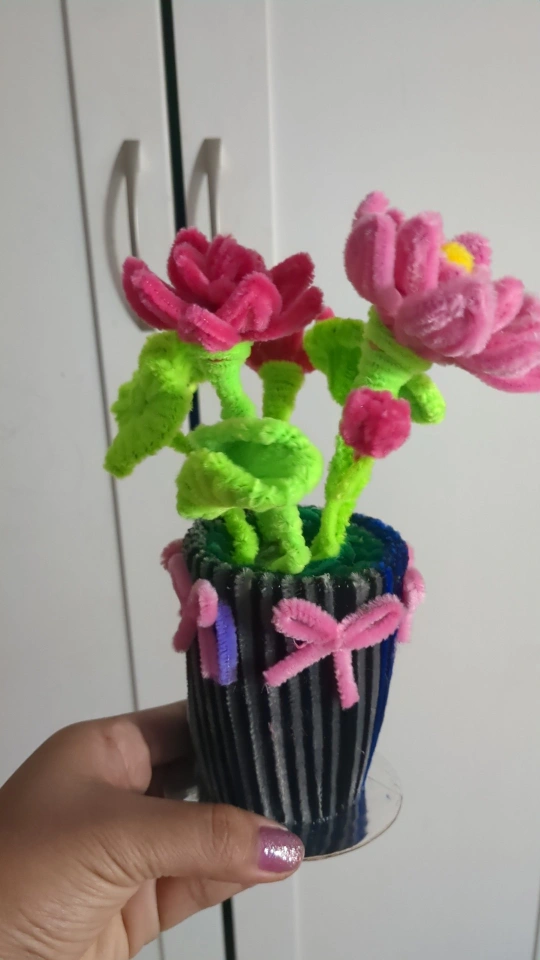 Adorable handmade pipe cleaner flower arrangement. Features pink and green pipe cleaners. Small vase included. Perfect for a desk or shelf.