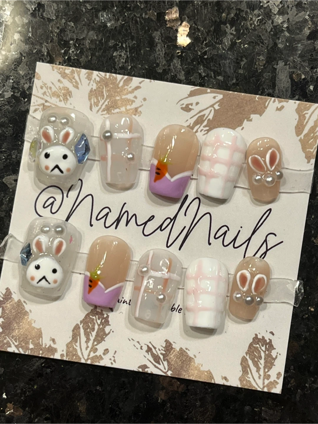 Adorable set of handmade press-on nails! Features cute bunny and carrot designs. Perfect for adding a touch of whimsy to your look