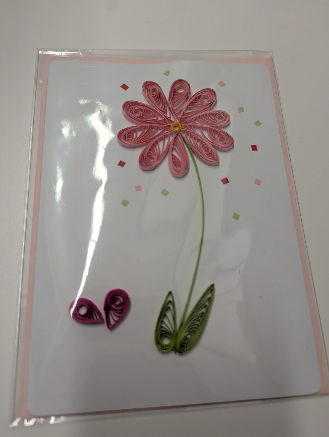 This is a beautiful handmade greeting card featuring a quilled flower design. Perfect for any occasion!