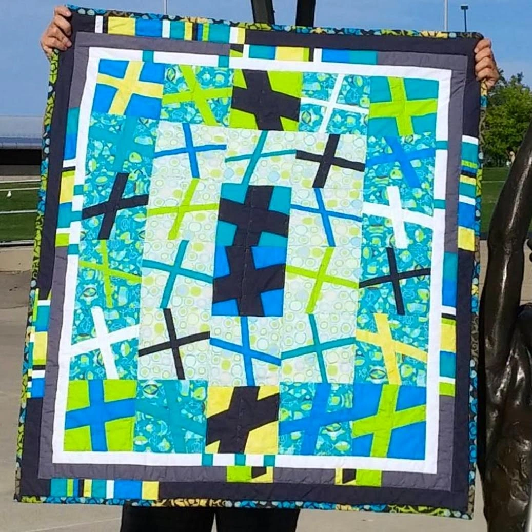 Handmade art quilt (stitched on a domestic sewing machine) with a unique 'Wonky Crisscrosses' design. It features a mix of blue, green, yellow, white, and grey colours in soft cotton fabrics. The quilt has a dark backing with inset design column. A wall-hanging sleeve is attached on the back. A charming addition to any home for warmth (lap size) or decor.