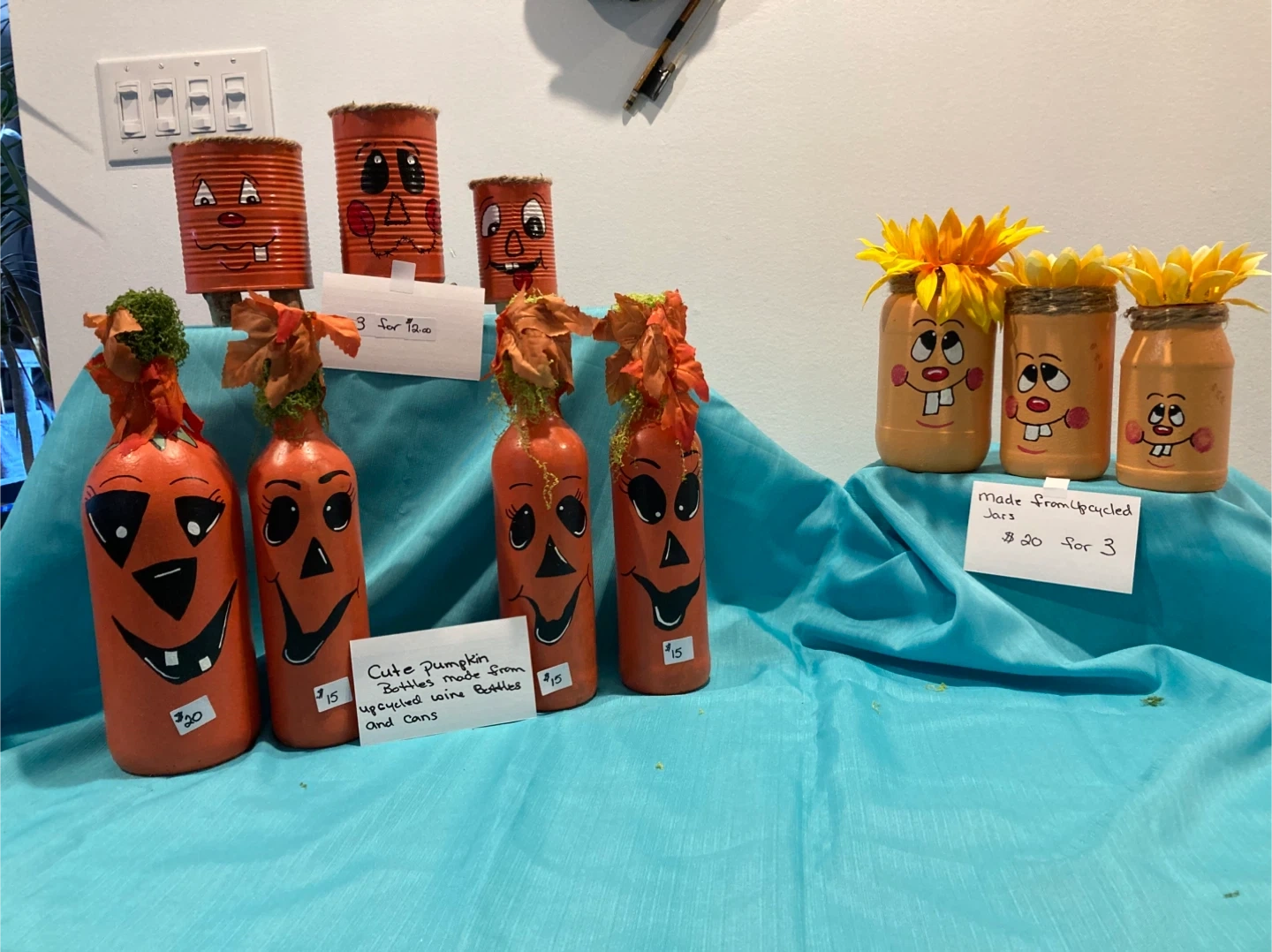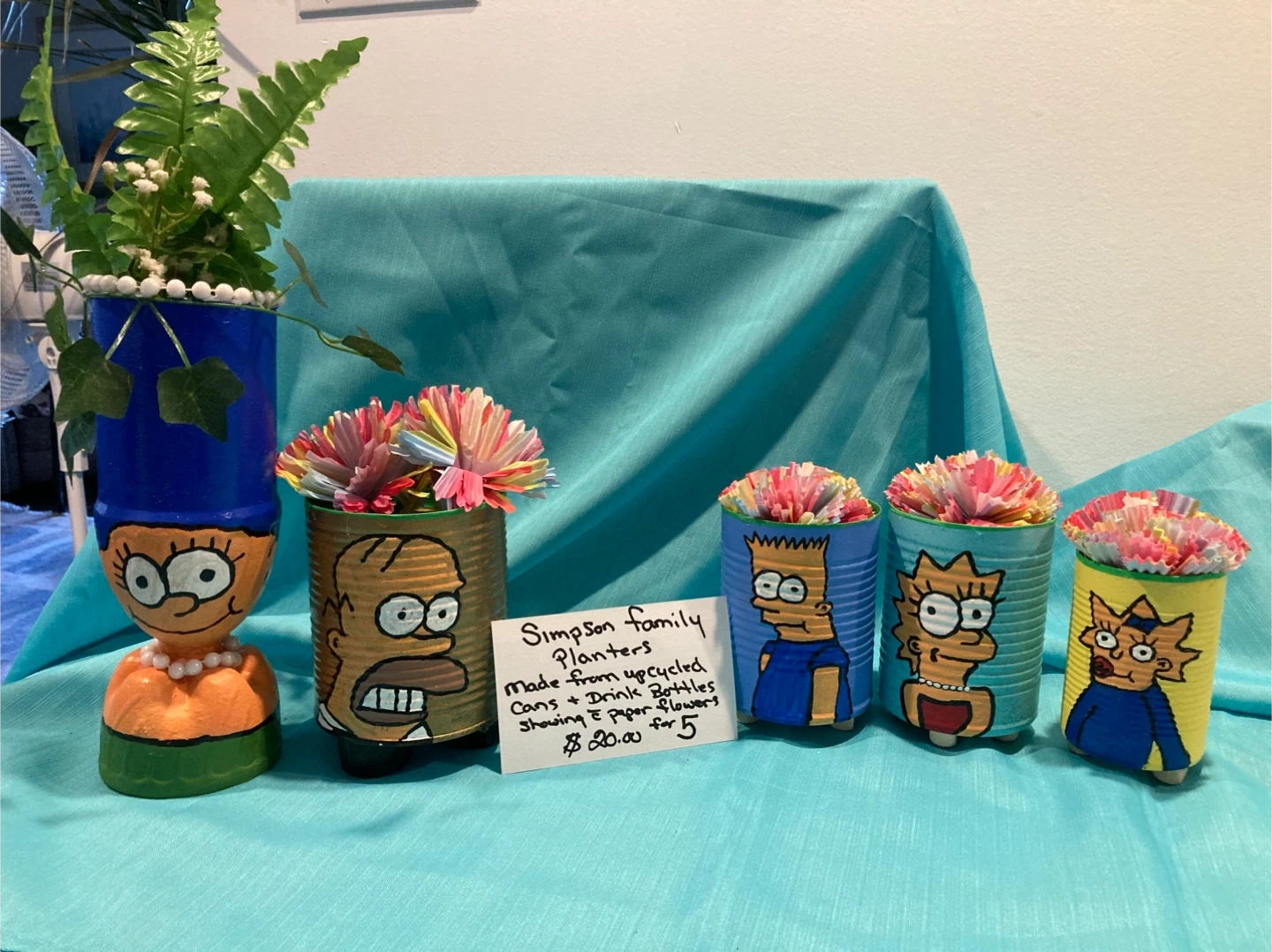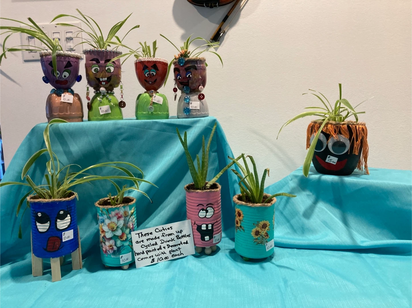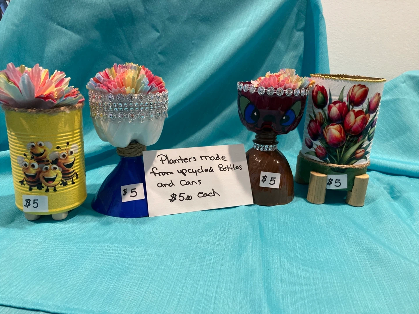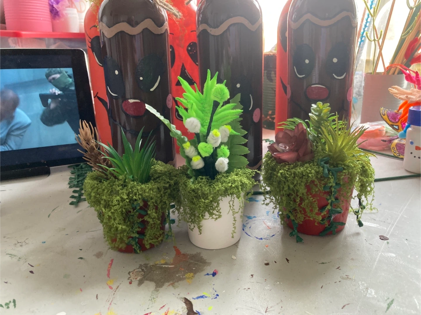 I'm selling these cute handmade art pieces. They are made from recycled materials like bottles and cans, and painted with fun designs. Perfect for adding a touch of whimsy to your home or as a unique gift!