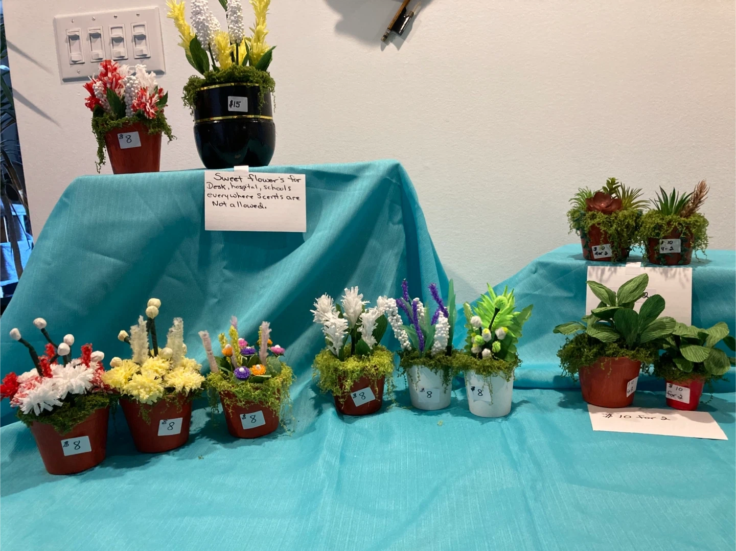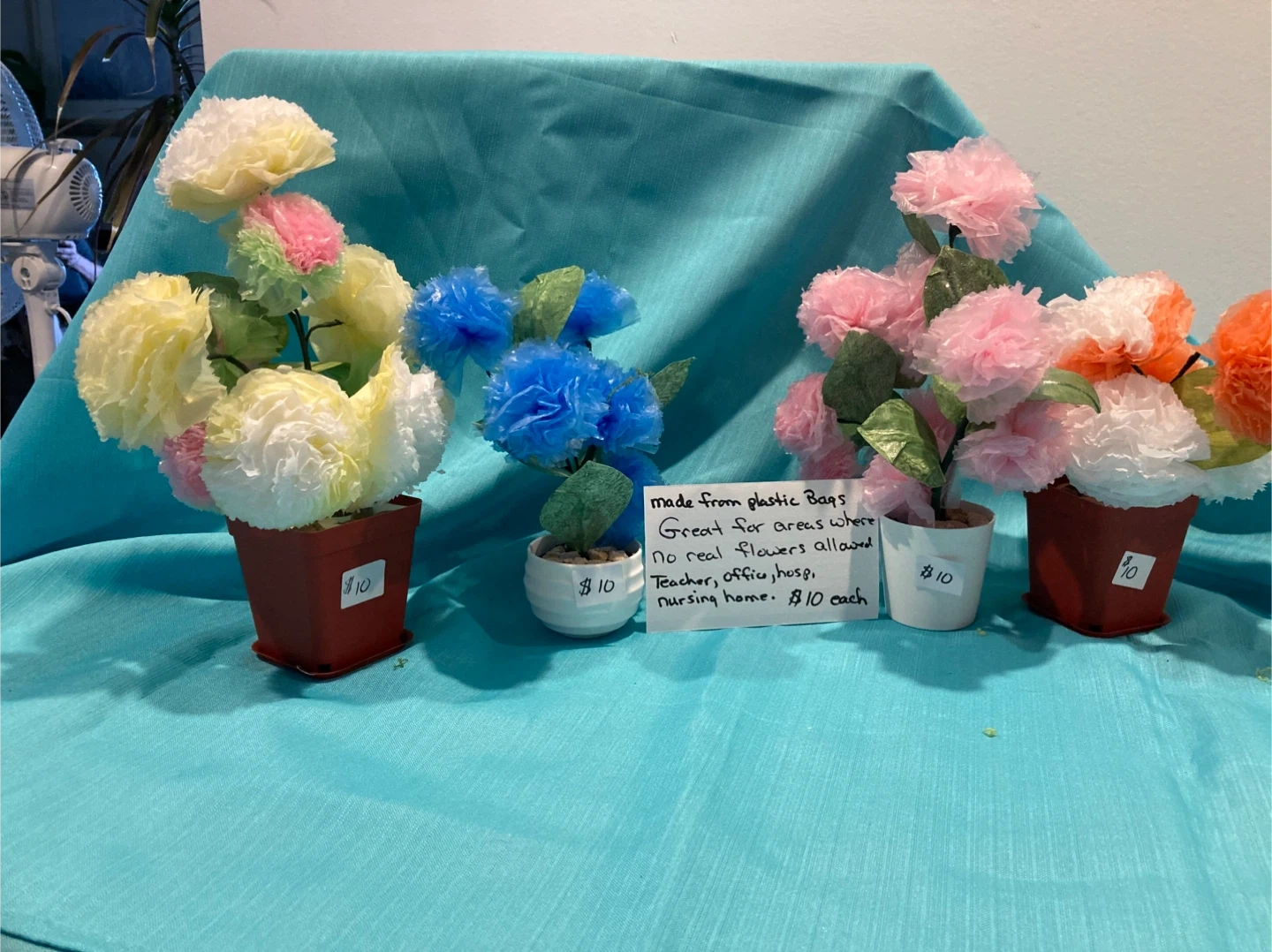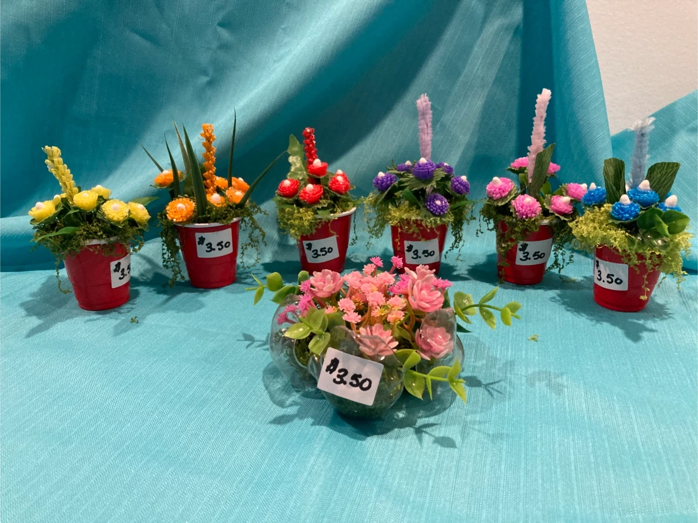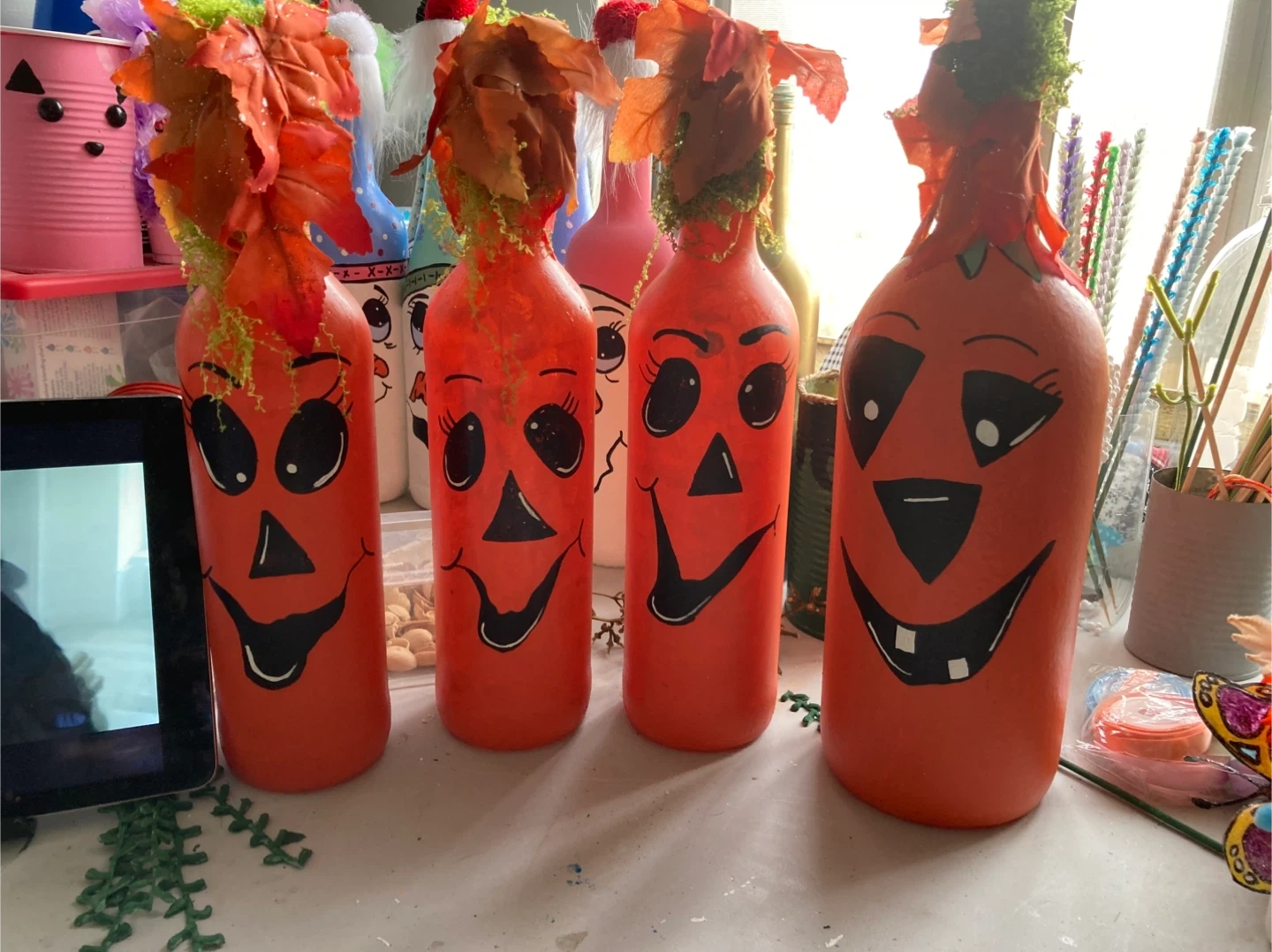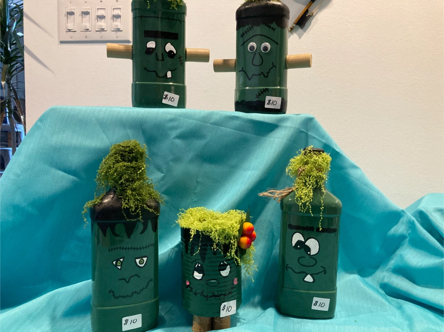 I'm selling these cute handmade art pieces. They are made from recycled materials like bottles and cans, and painted with fun designs. Perfect for adding a touch of whimsy to your home or as a unique gift!