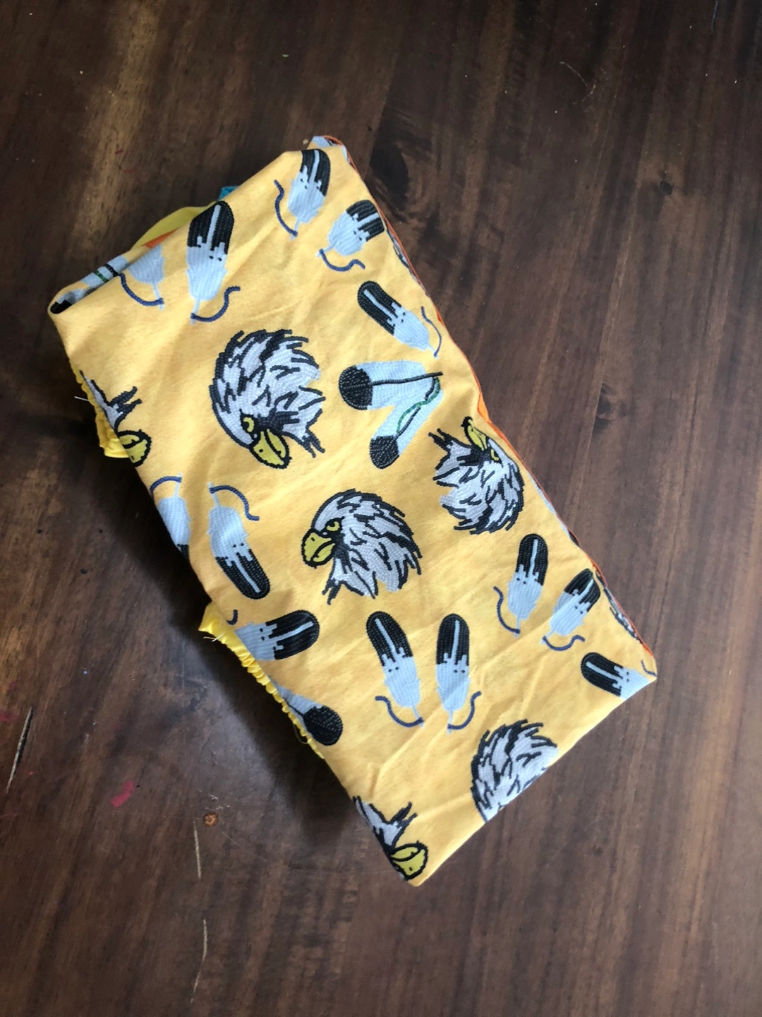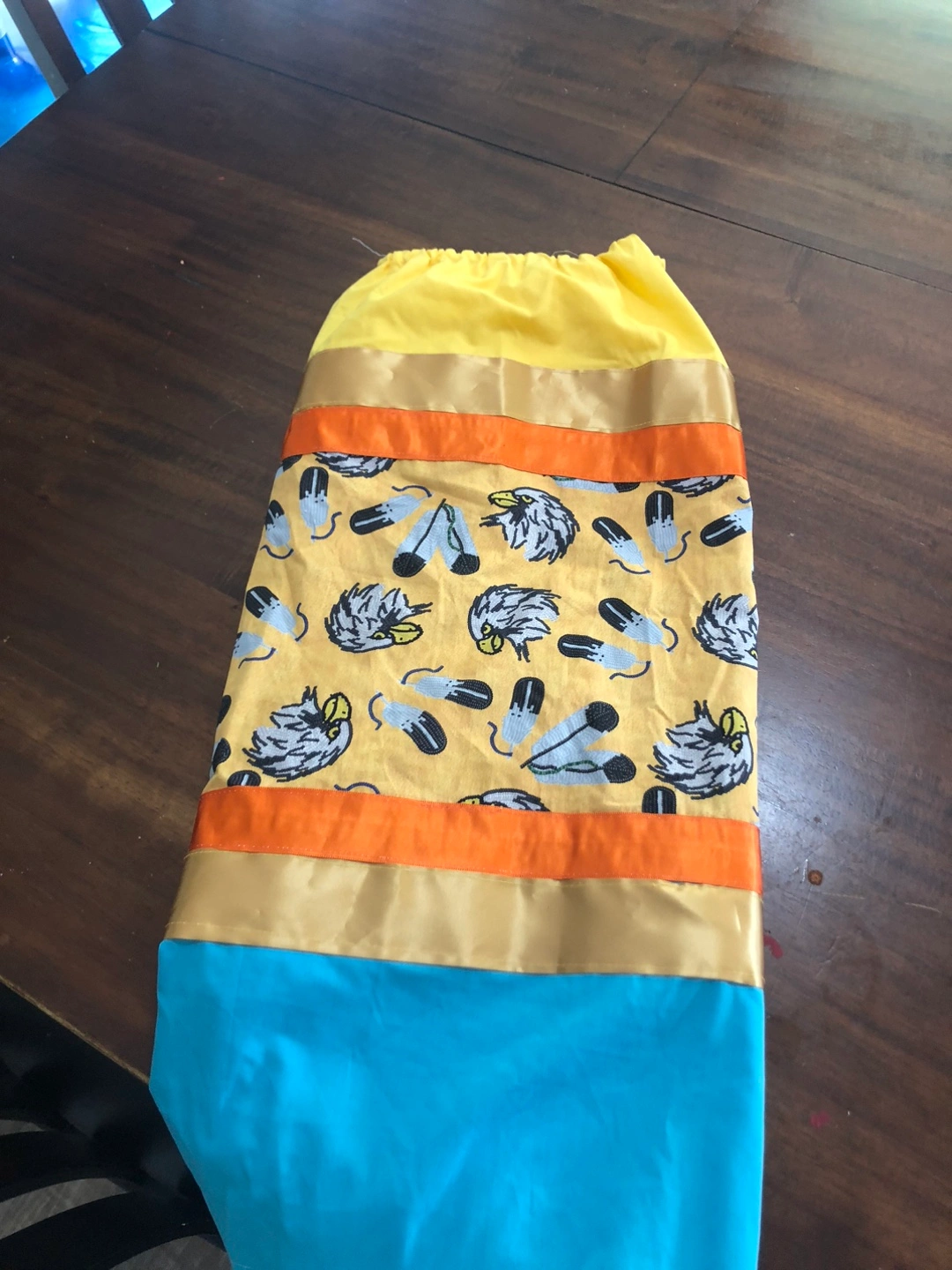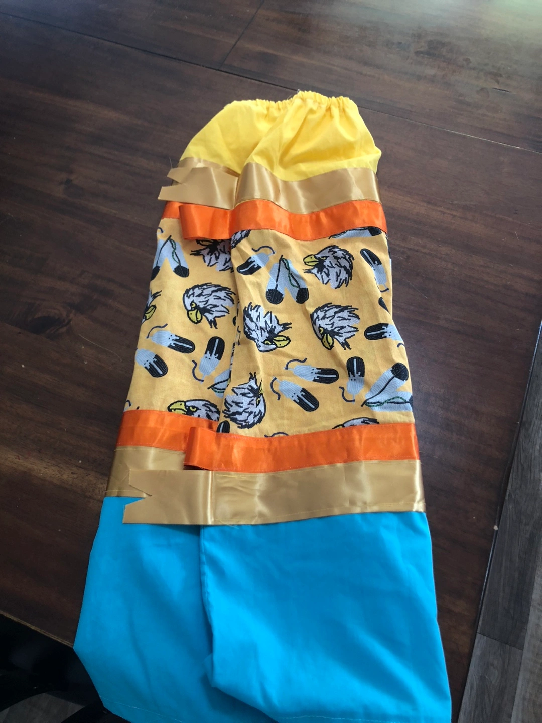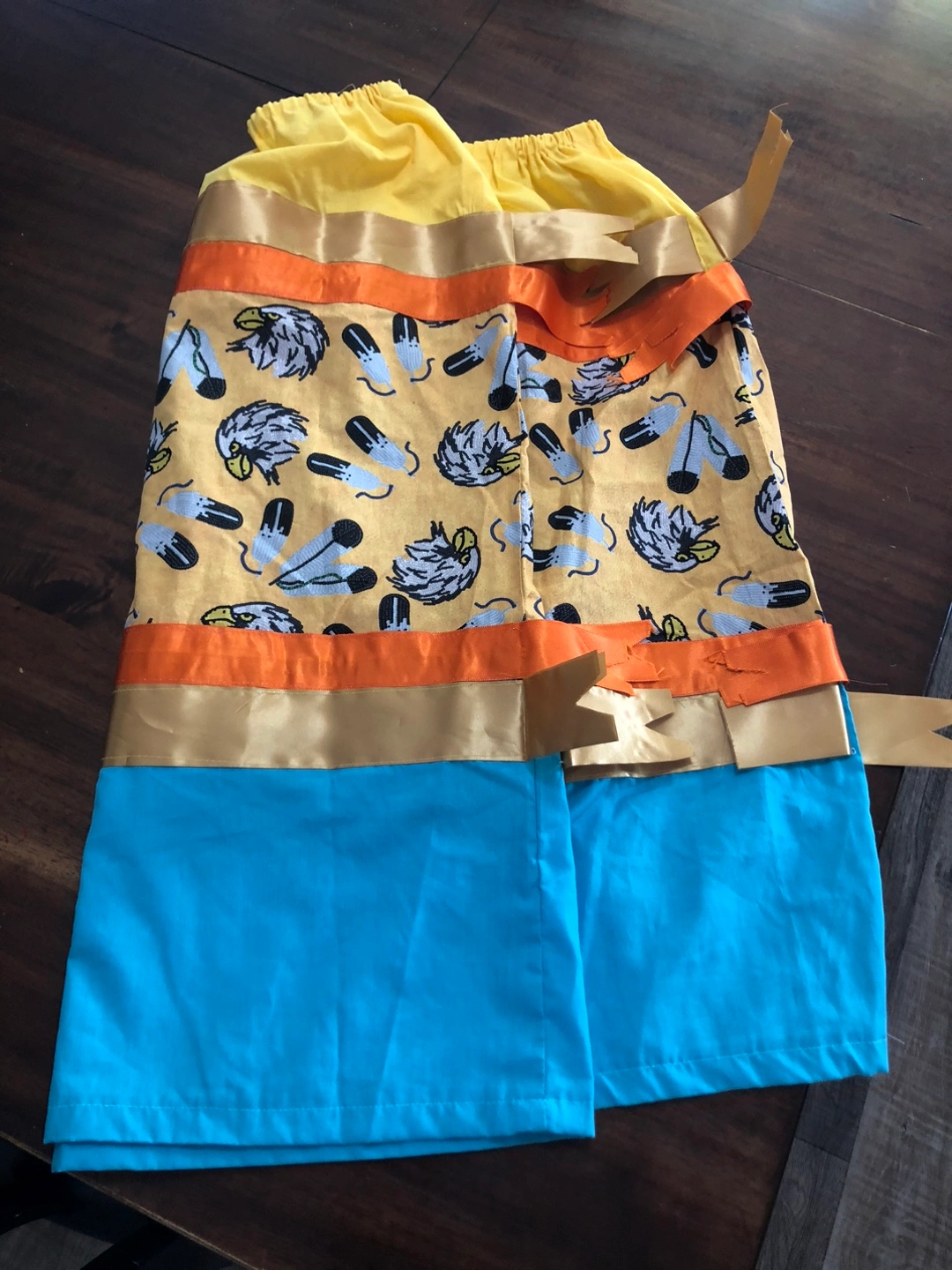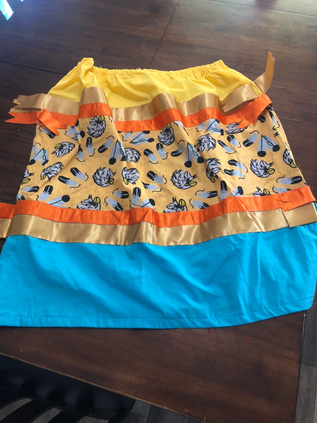Selling a handmade ribbon skirt with a vibrant design! It features a yellow top, a patterned middle section with eagle and feather motifs, orange and gold ribbon accents, and a blue bottom. Perfect for cultural events or as a unique fashion statement