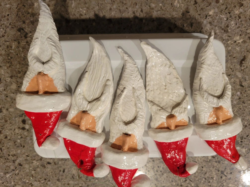 These are handmade Santa ornaments. Features a red hat, white beard, and painted face. String attached for hanging. Adding these to your Christmas tree can create a festive and cozy atmosphere.