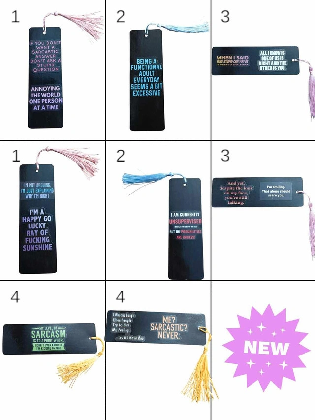 15Handmade Sarcastic Bookmarks. $2 each. Bookmarks are double sided - see pictures to see both sides. Tassel colour may be changeable depending on availability. Pick up near Banwell and the Expressway.