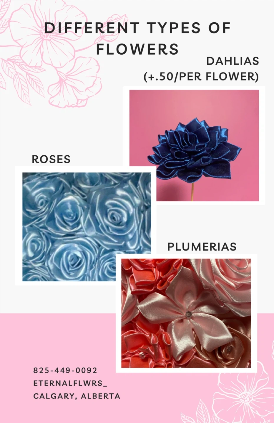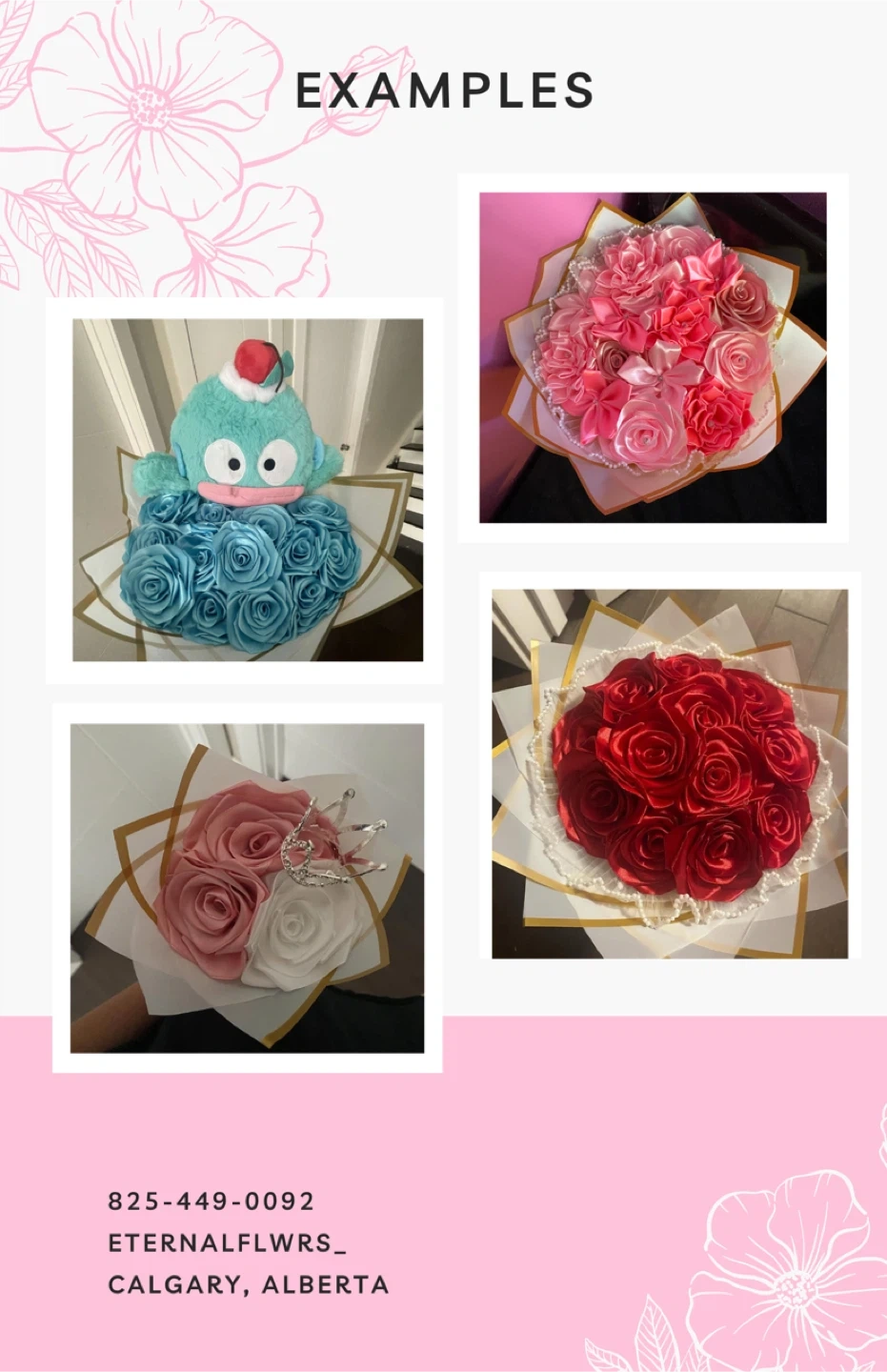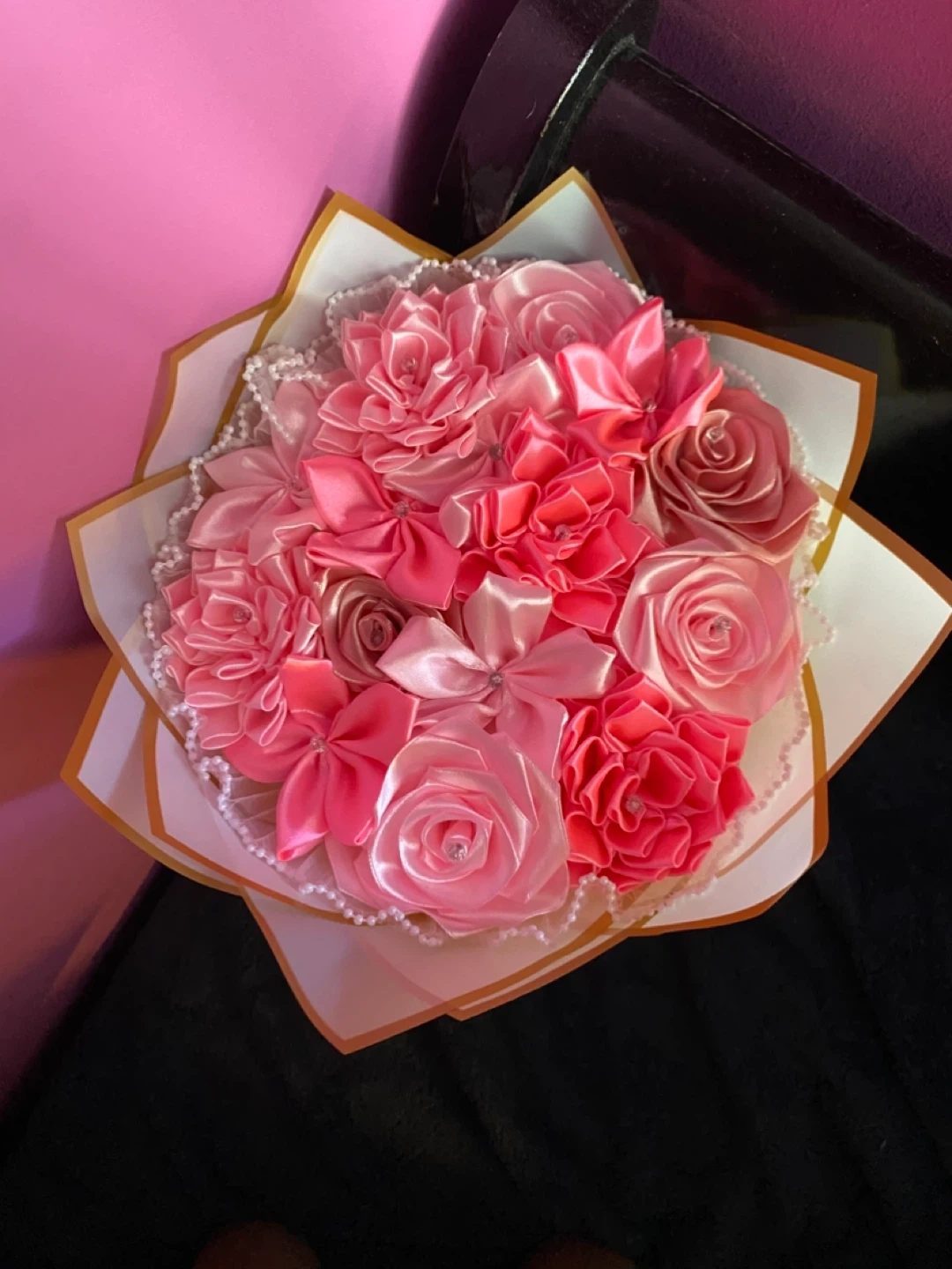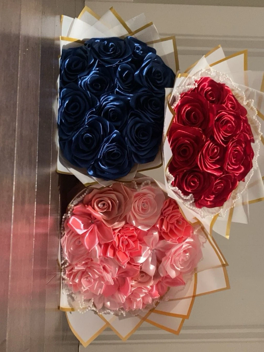 10Selling beautiful handmade satin rose flower bouquets! These come in a variety of colours, including red, blue, pink, etc. Perfect for a special occasion or just to brighten up your space! Order more than a week in advance.