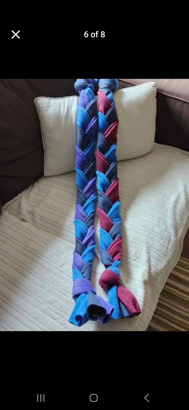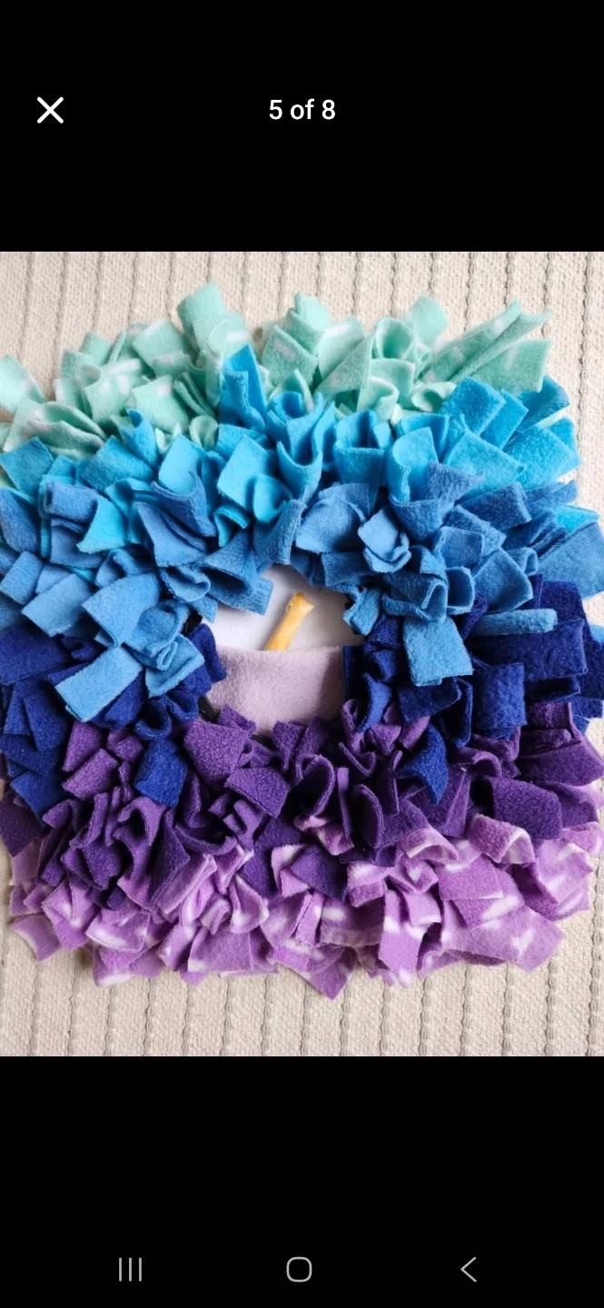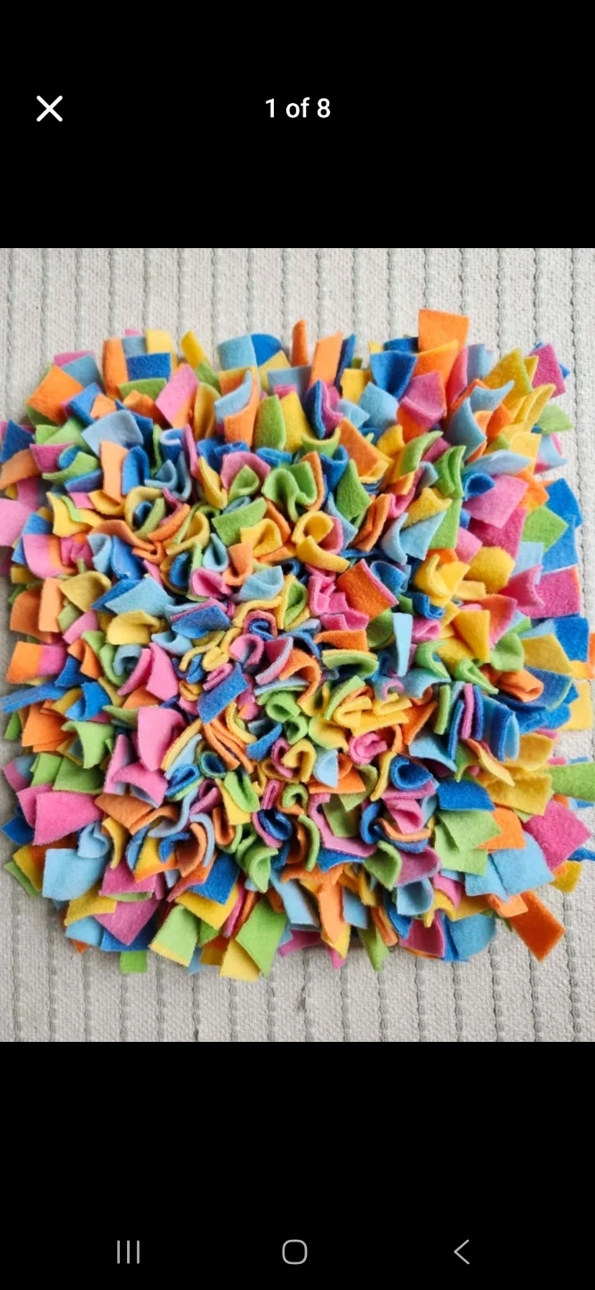 83Brand new handknotted snuffle mat and snuffle braid enrichment toys for pets (dogs, cats, bunnies, guinea pigs, etc.). It's for hiding treats or dry food in, for your pet to sniff, find and eat. Happy nose, mind and tummy! MATS: approx 12x12 inches. No centre pocket $30, With centre hidey pocket $35. Each made with over 100 new fleece fabric strips (prewashed in non-toxic detergent) and kitchen sink mat (NOT the toxic smelly black floor mats that are often used to make these mats). Handwash, air dry. Premium dry dog food sample of your choice included. BRAIDS (more difficult for pets to find treats than mats): approx 40 inches. $20 each. Tuck dry food pieces or treats in the folds of the braid for your pet to find. Made with brand new fleece fabric (prewashed in non-toxic detergent). Machine wash and air dry. As with all pet toys, use only with supervision. Custom colours also available with deposit. Non smoking home. Pick up at Elmbrook Park Library in Etobicoke. Possible delivery to North York, Mississauga or Milton depending on my schedule for an extra fee.