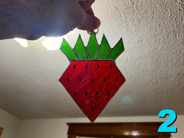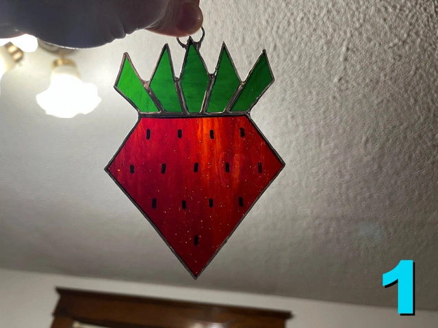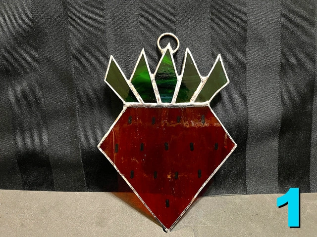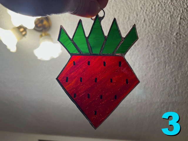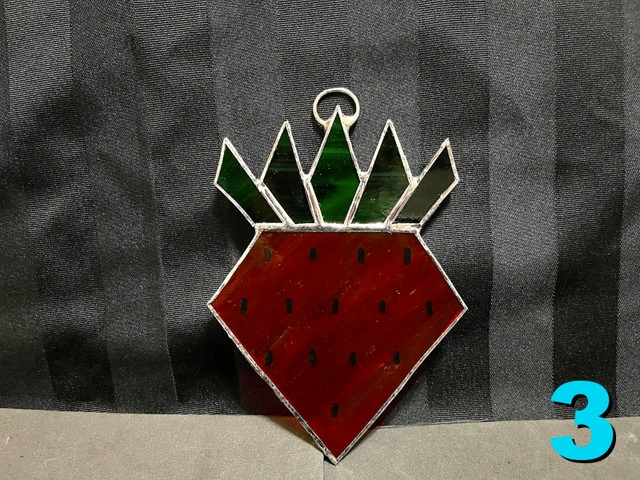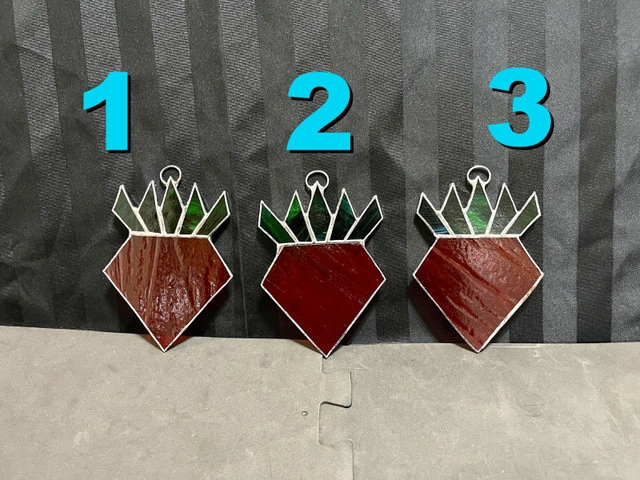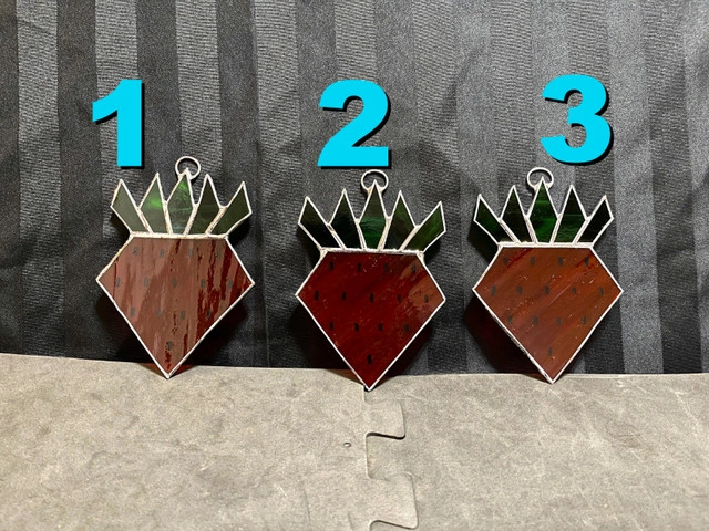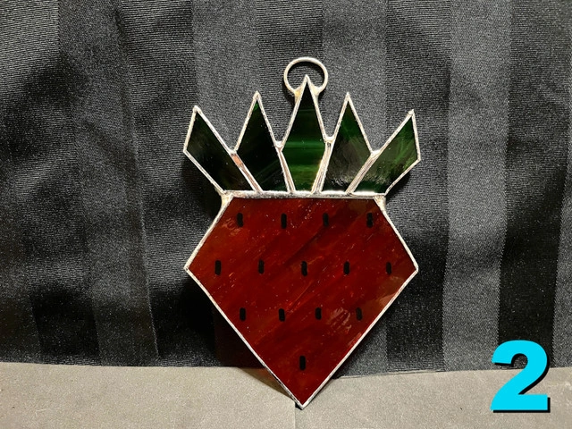 Three new custom handmade angular stained glass strawberries to choose from. Size: 6.75" x 4" (172mm x 102mm) Care Instructions: Seeds are painted on with an Oil-based paint marker and is water resistant only. If dirty, clean by wiping with damp cloth, do not scrub near seeds (else face will come off). I designed and made this pattern from scratch. Please do not copy without permission. Might be willing to sell a digital pattern. Still a little new at stained glass, might not be 100% like someone with decades of experience, please do check pictures and let me know which item number you are interested in. Priced a little lower than I'm seeing similar sized and complexity pieces for as I'm still new and learning. Money is going to more supplies, and glass for future designs. Pickup is on Strange Street in Kitchener (near Grand River Hospital). I'm free weekdays and weekend afternoons and evenings most nights. $25/each. Art prices are firm and are non-negotiable. I don't drive; Pickup only. Cash or e-Transfer only. No trades.