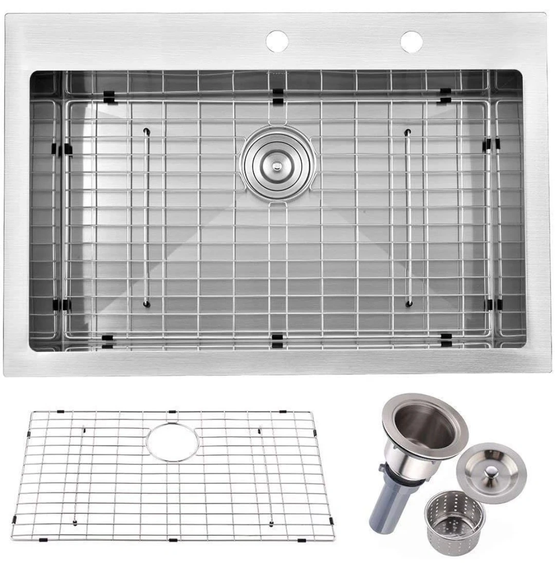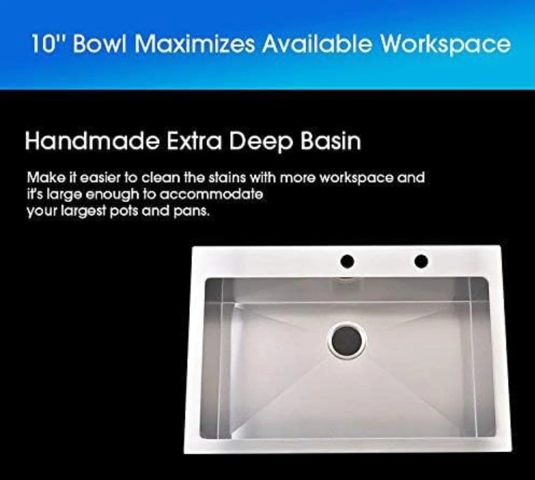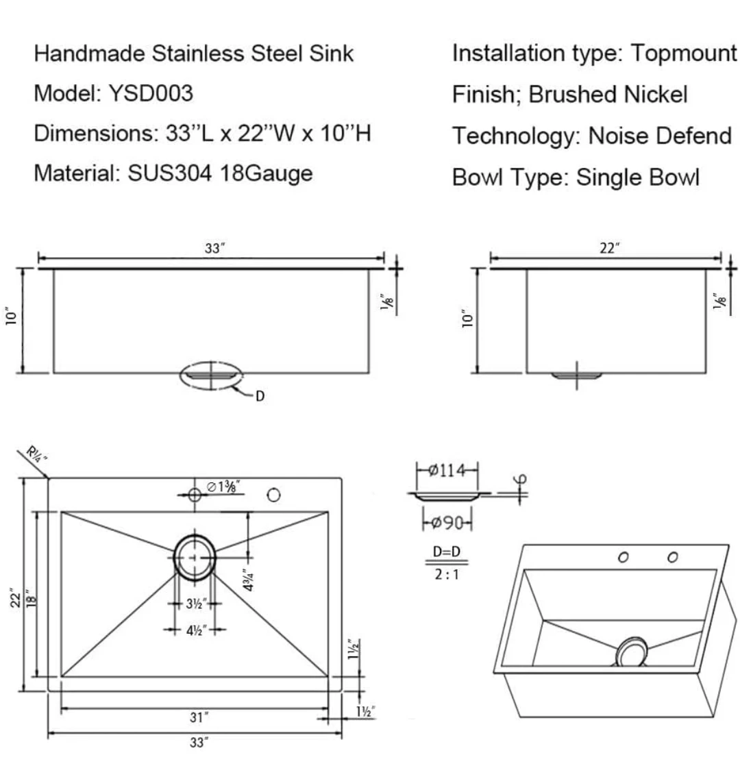 37Selling a Friho handmade stainless steel kitchen sink. Key features: - Model YSD003 - Dimensions: 33" L x 22" W x 10" H - Material: SUS304 18Gauge - Installation type: Topmount - Finish: Brushed Nickel - Technology: Noise Defend - Bowl Type: Single Bowl