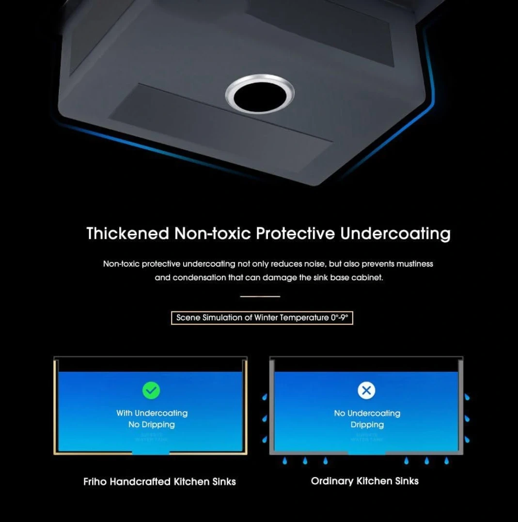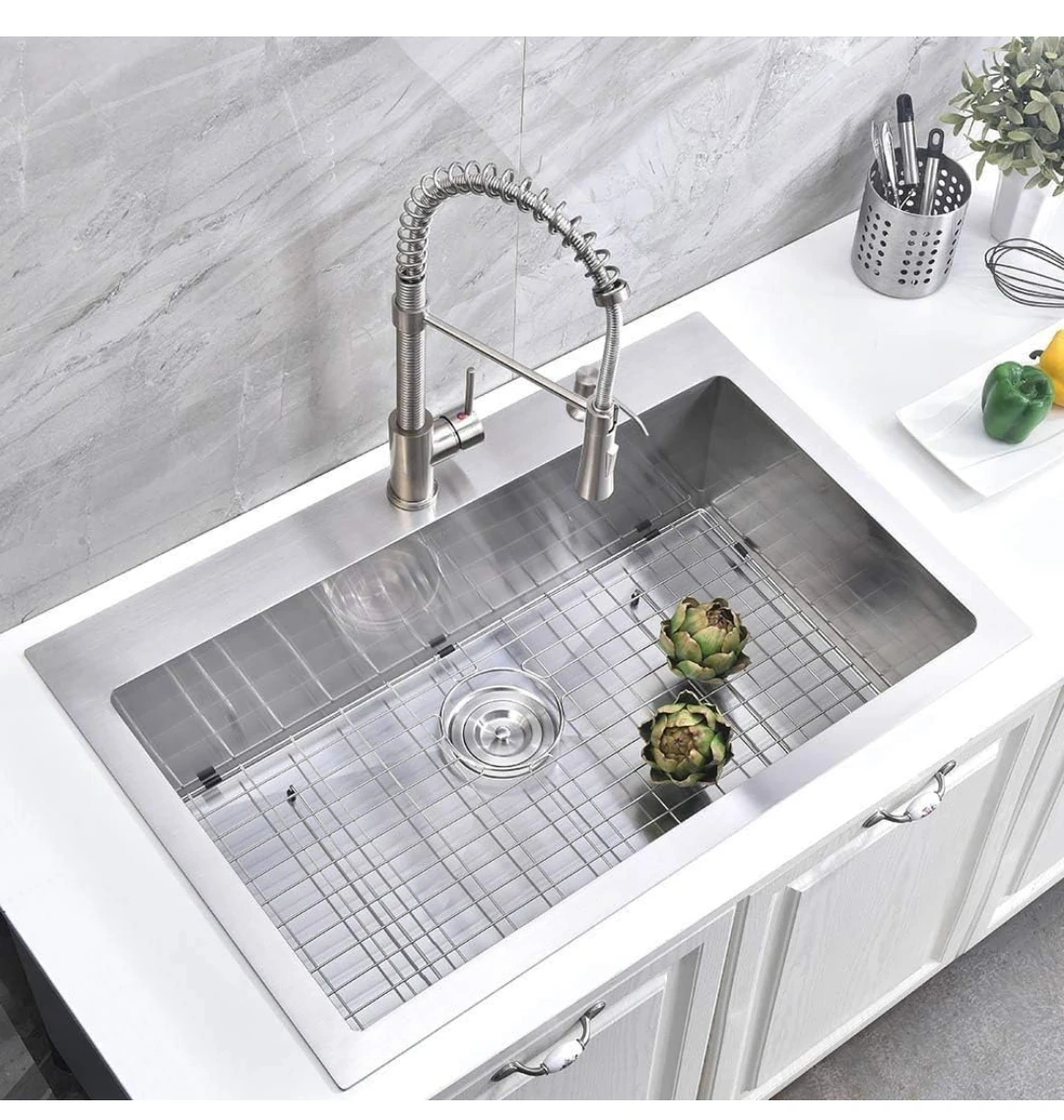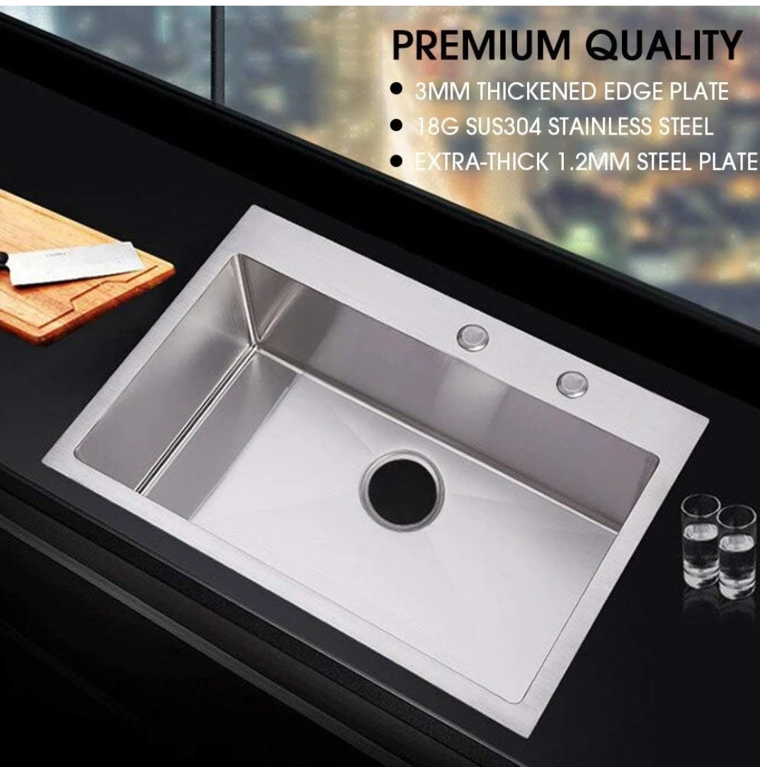 37Selling a Friho handmade stainless steel kitchen sink. Key features: - Model YSD003 - Dimensions: 33" L x 22" W x 10" H - Material: SUS304 18Gauge - Installation type: Topmount - Finish: Brushed Nickel - Technology: Noise Defend - Bowl Type: Single Bowl