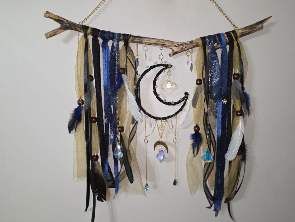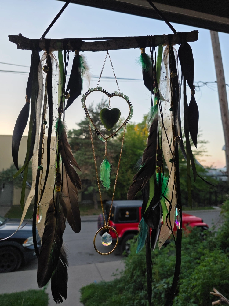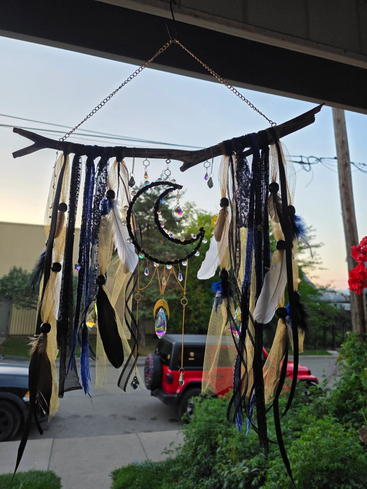5Check out this unique handmade suncatcher/dream catcher! It features a natural branch, ribbons, feathers, and crystal accents. Perfect for adding a whimsical touch to any room