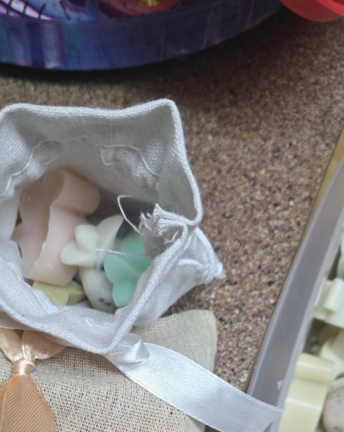 60I'm selling a collection of handmade wax melts in a cute burlap bag! They come in a variety of shapes and colours, perfect for adding a lovely scent to your home