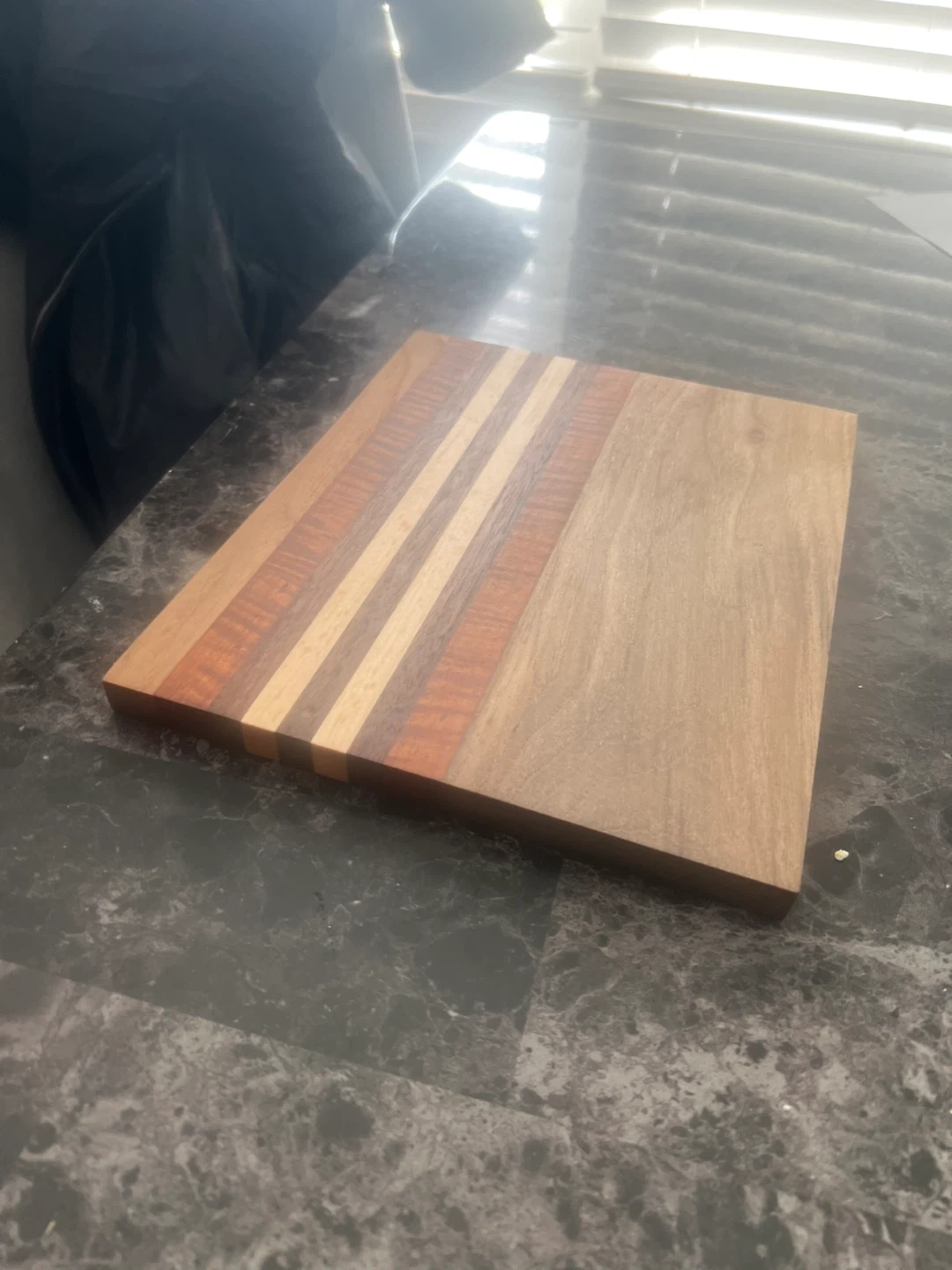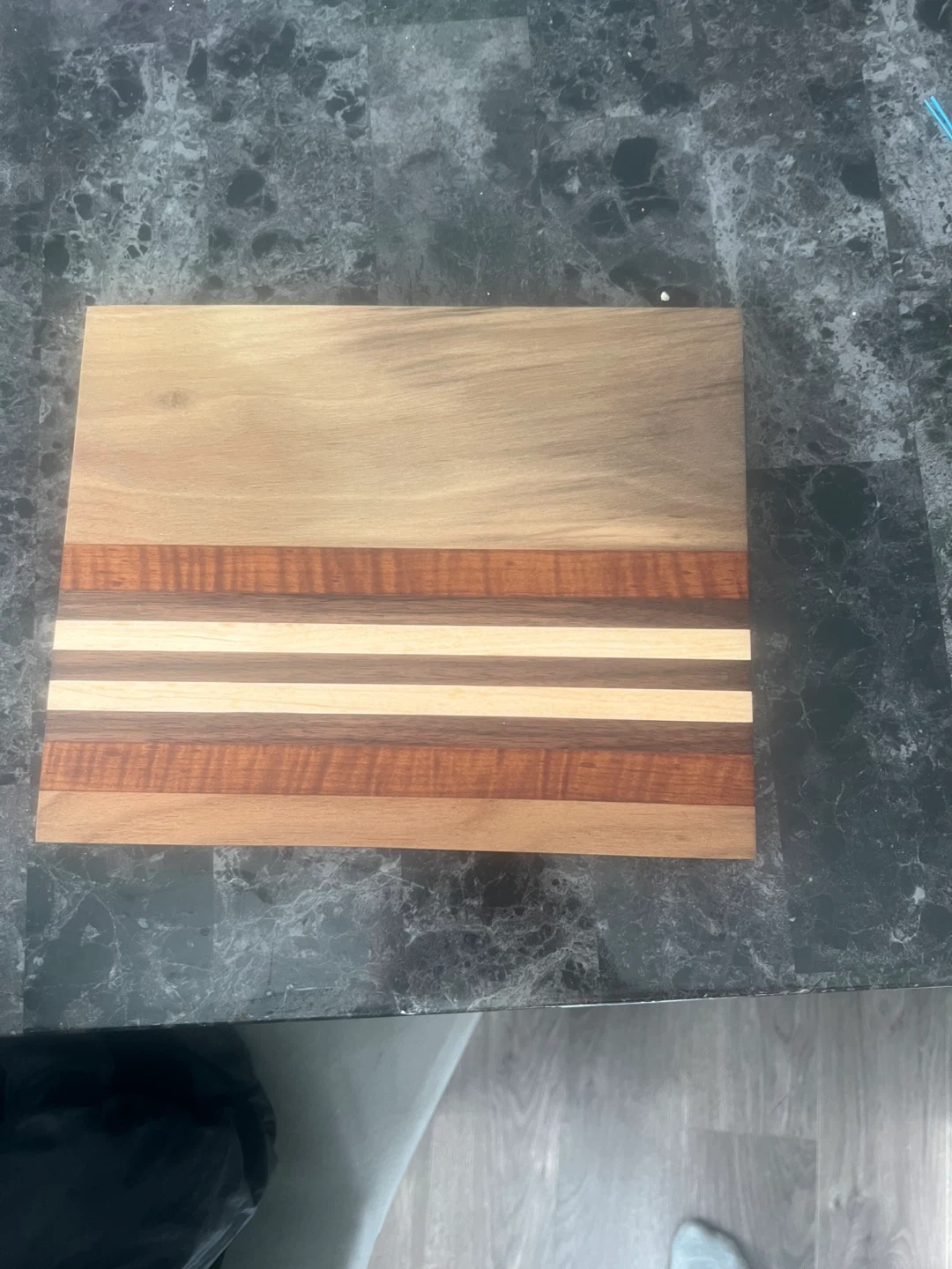 17Selling a beautiful handmade wooden cutting board. It's in great condition and would be a lovely addition to any kitchen. The board features a unique striped design with different wood tones. It's perfect for chopping veggies or serving charcuterie