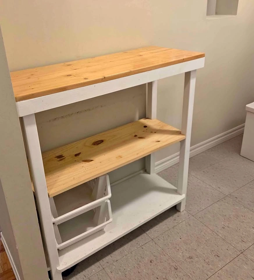Sturdy handmade kitchen storage table/shelf with 3 tiers, perfect for extra counter space, pantry organization, or even as a coffee station. Details: Dimensions: 35" W × 13 ½" D × 36 ½" H Solid wood top & middle shelf, painted white frame A few stains, but could look brand new with a quick paint touch-up or wipe Strong and stable — built to last 📍 Pickup near River & Dundas st E