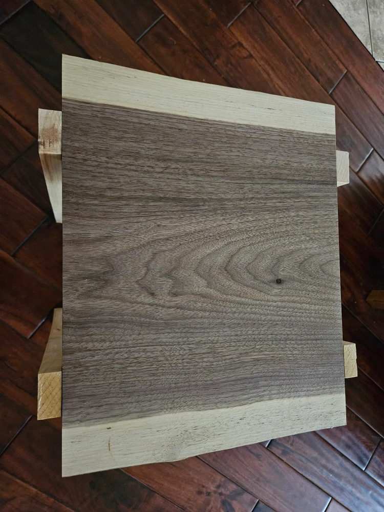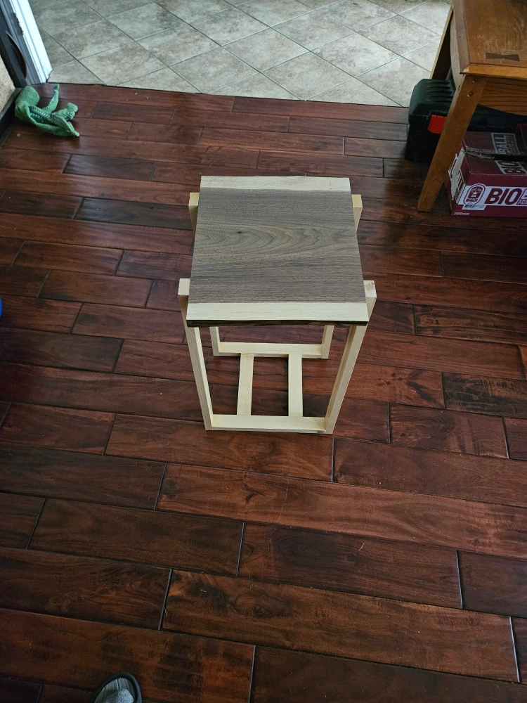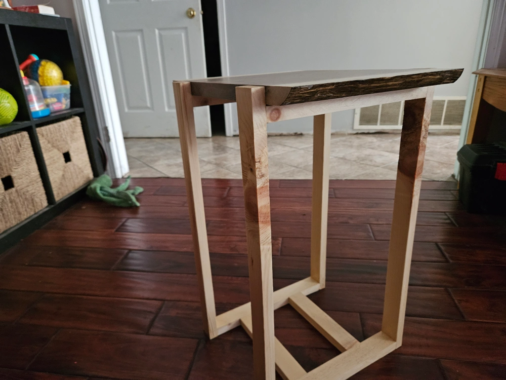 Selling a unique, handmade wooden side table! It features a beautiful dark wood top with a natural edge and a light-coloured wooden base. Perfect for adding a rustic touch to any room in your home multiple tables avaliable upon request