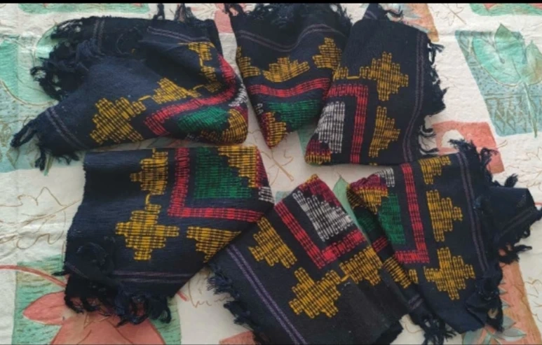 Selling a set of handmade woven coasters. They have a unique pattern with colours including red, green, yellow, and white. They are in good condition and would be a nice addition to any home!