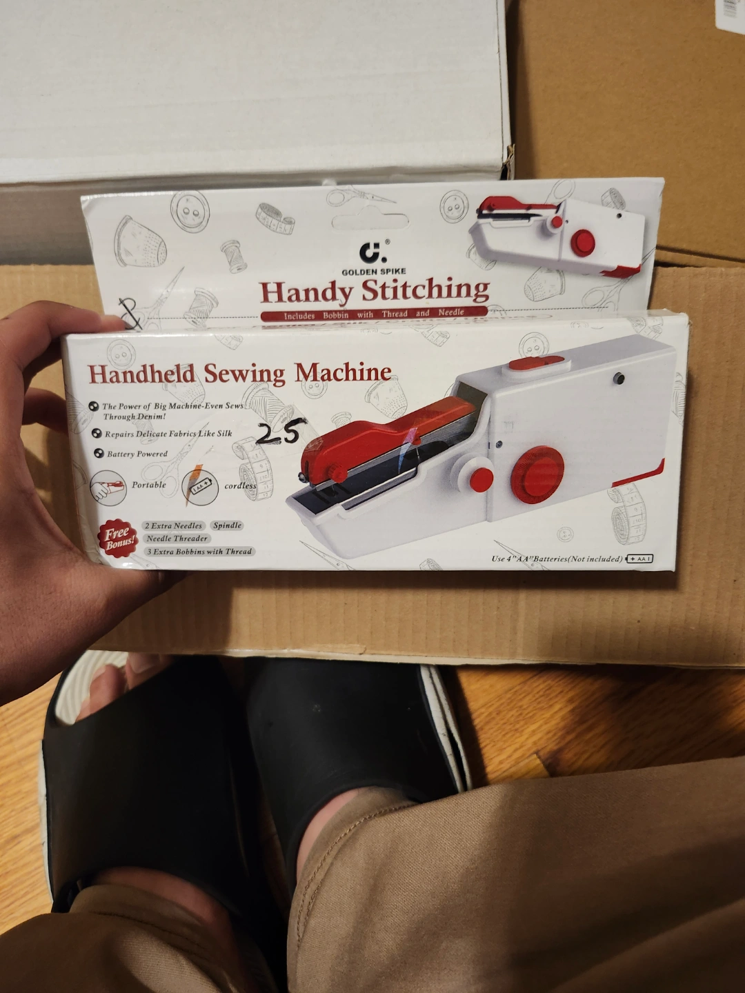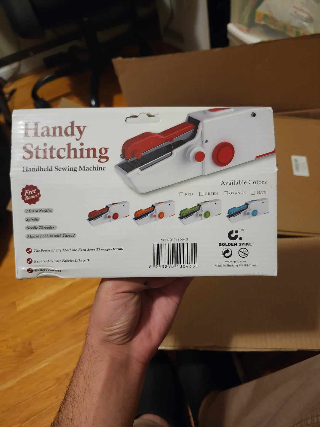 Portable cordless sewing machine. Sews through denim! Repairs delicate fabrics like silk. Includes bobbin, thread, and needle. Requires 4 AA batteries (not included). Brand new price on Amazon $23.