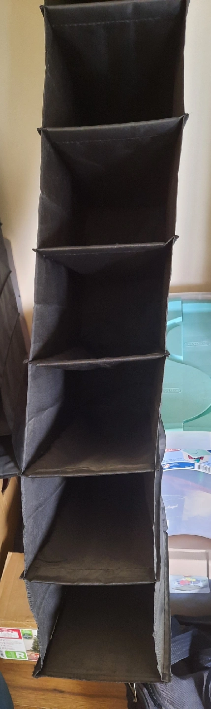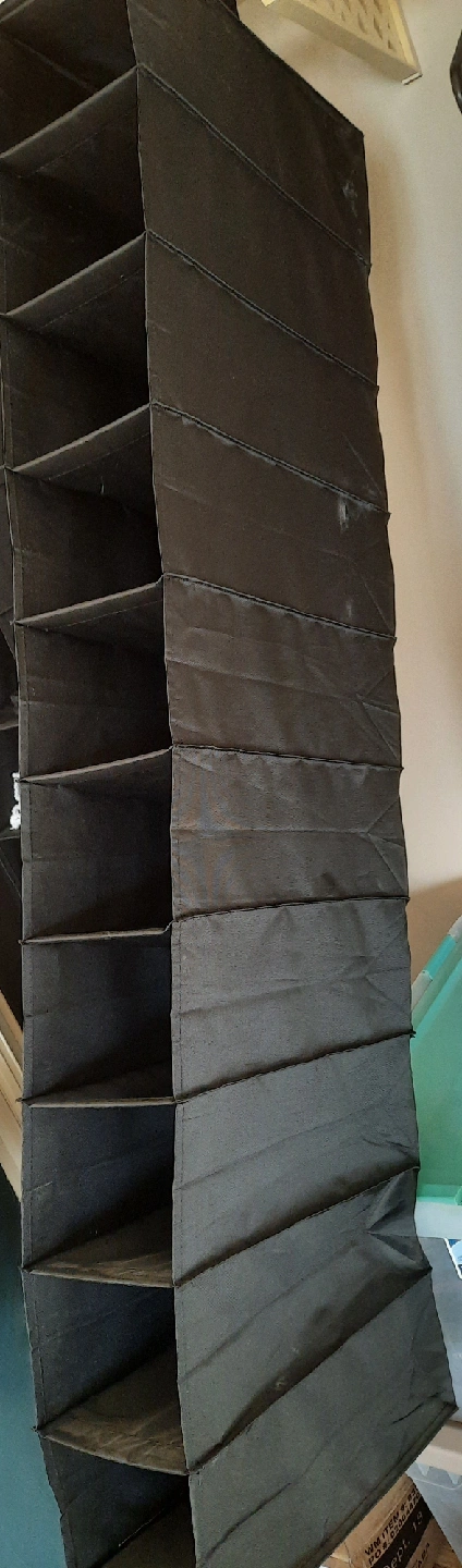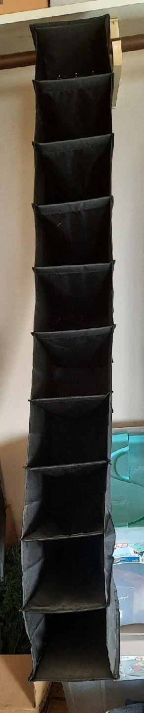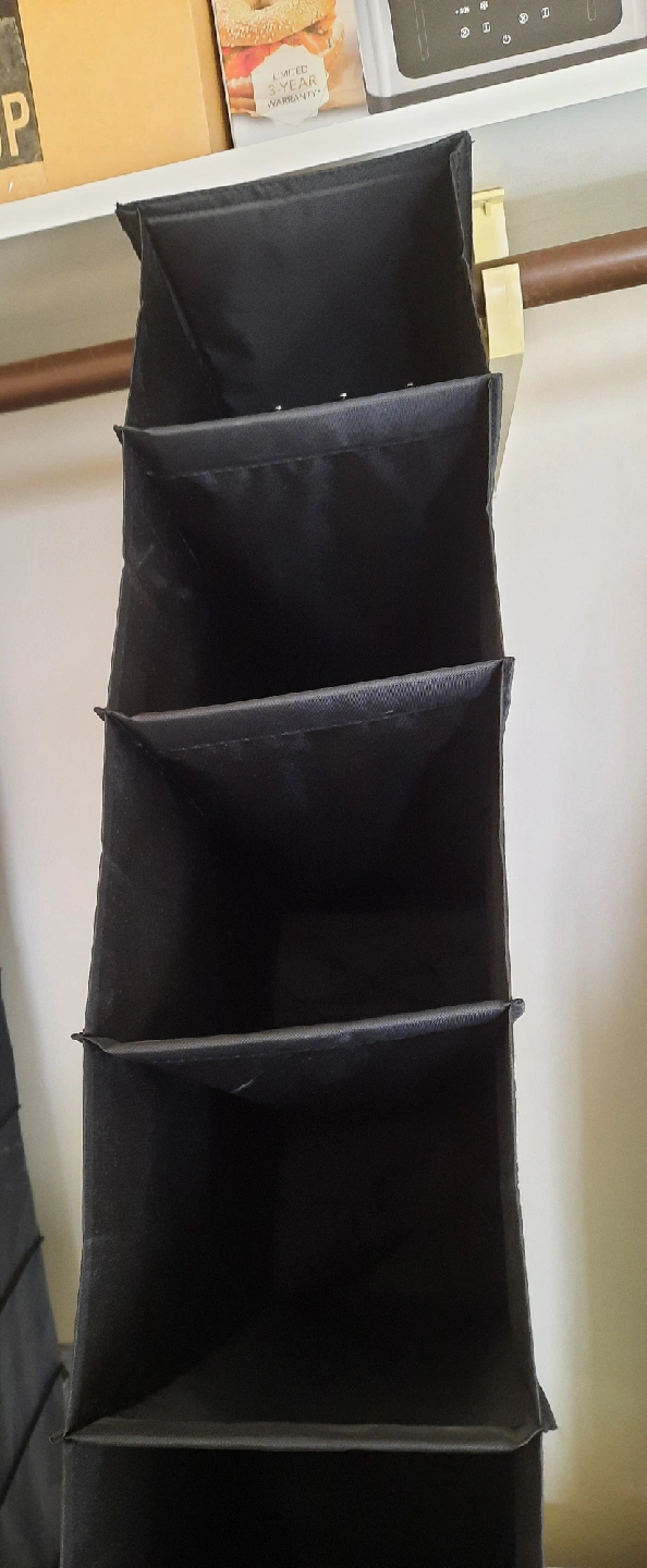 108This type of organizer is designed to be hung from a closet rod and provides multiple compartments for storing items like clothes, shoes, or accessories, helping to maximize vertical storage space in a wardrobe or closet.