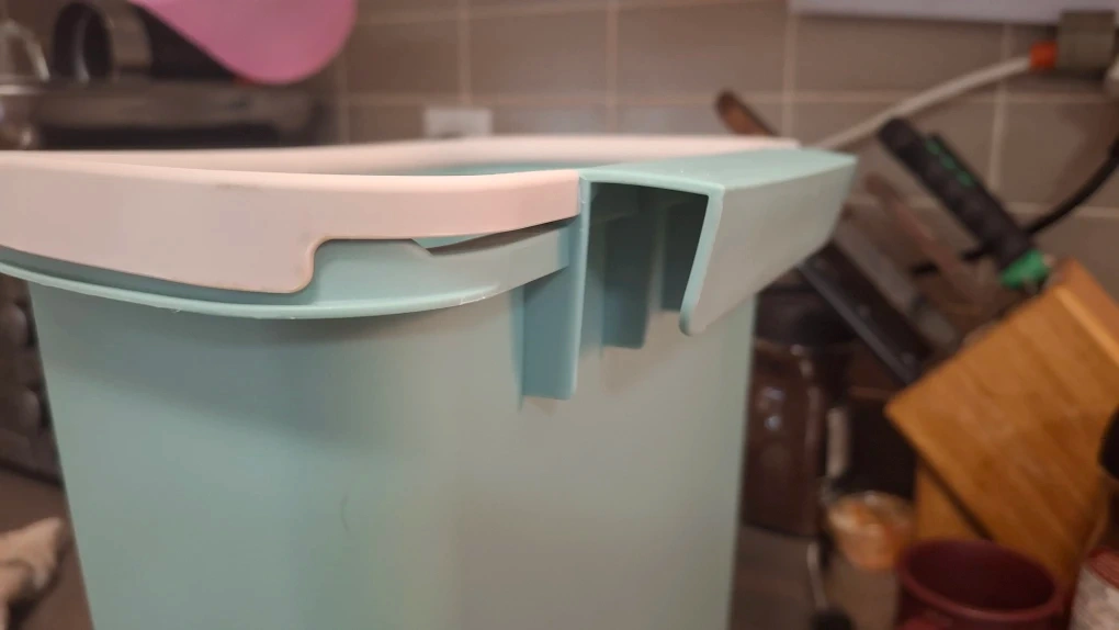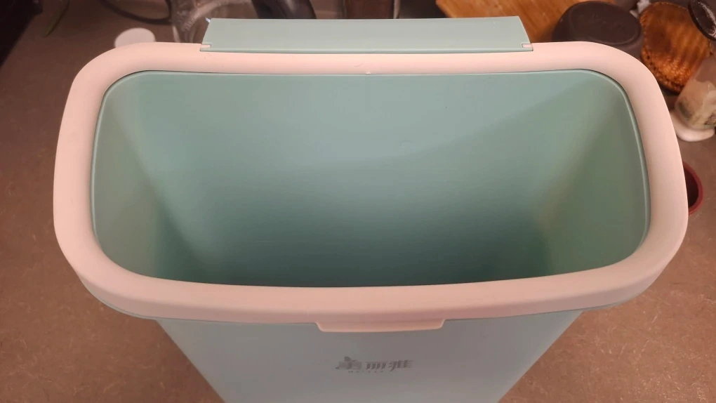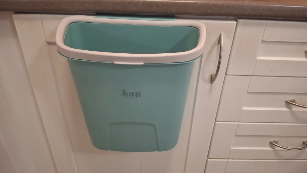 1000+This handy mint green trash can is perfect for hanging in your kitchen! It's a great space-saving solution and keeps your counters clean. It's in great condition and ready for a new home 29cm x 15cm 29cm height
