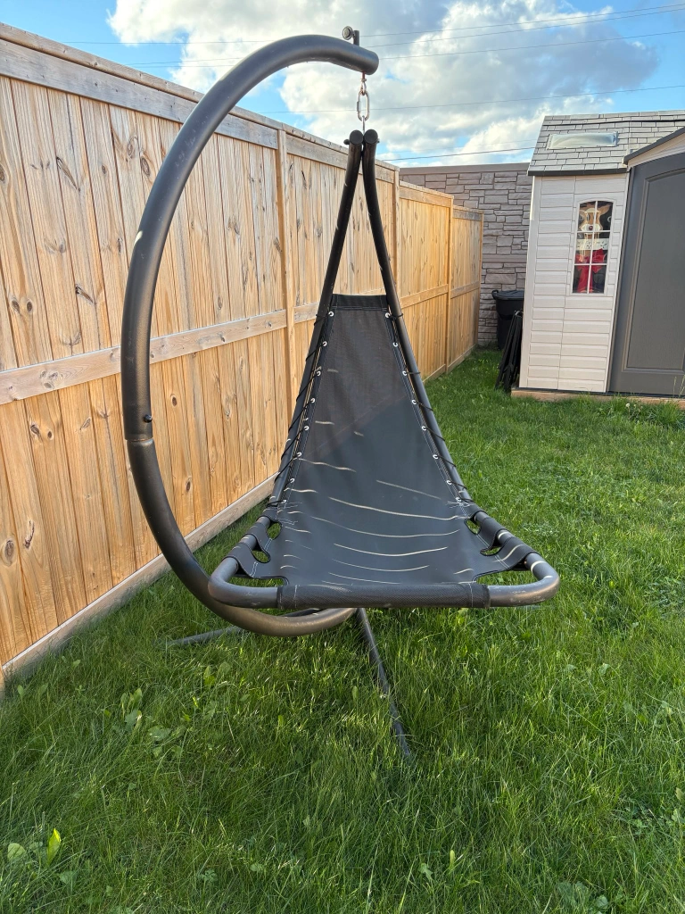 Looking to add a cozy spot to your backyard or patio? This hanging chair with a sturdy stand is just the thing! It's perfect for relaxing with a book or enjoying the sunshine. The chair is in great condition and ready for a new home. It's a super comfy and stylish addition to any outdoor space. located in Carleton Place, but can have it brought to Bridlewood
